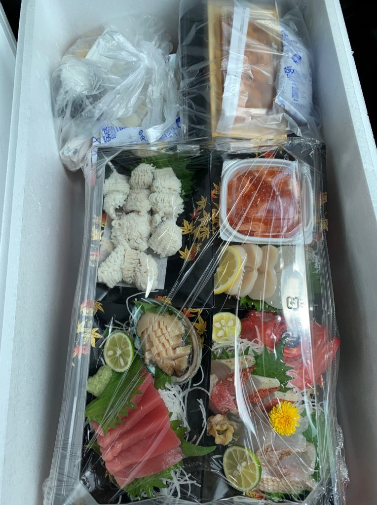 待ちきれず箱を開けると中には刺身盛り合わせとうにが!