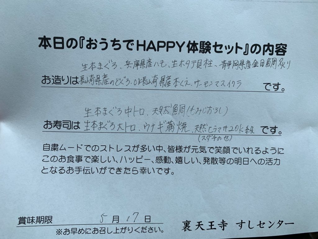 その名も「おうちでHappy体験セット」と名前だけ聞くと中身が全く想像できないものでした。何でも40000円相当の海鮮セットが10800円(税込)でテイクアウトできるとのこと。