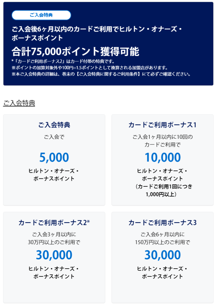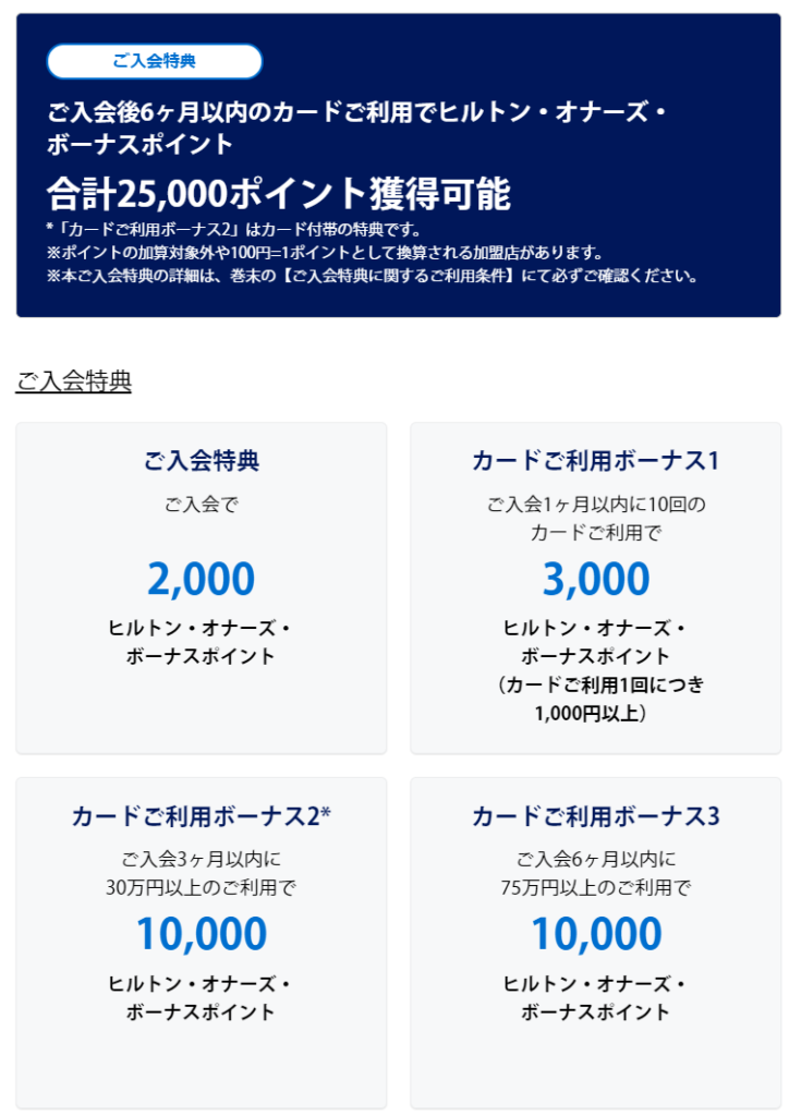 ※ヒルトン・オナーズ・ボーナスポイント加算後に、物品、サービスの購入の取消し等によりカードご利用金額の調整があった場合は、次回以降のヒルトン・オナーズ・ボーナスポイント加算時に相殺いたします。