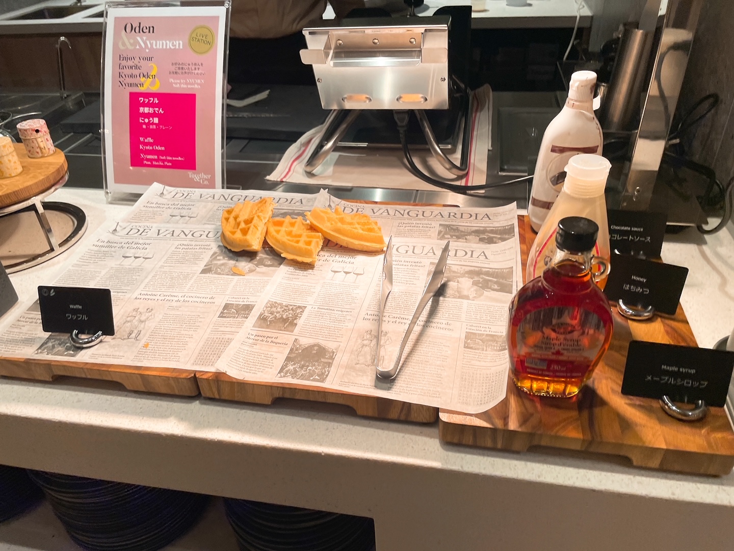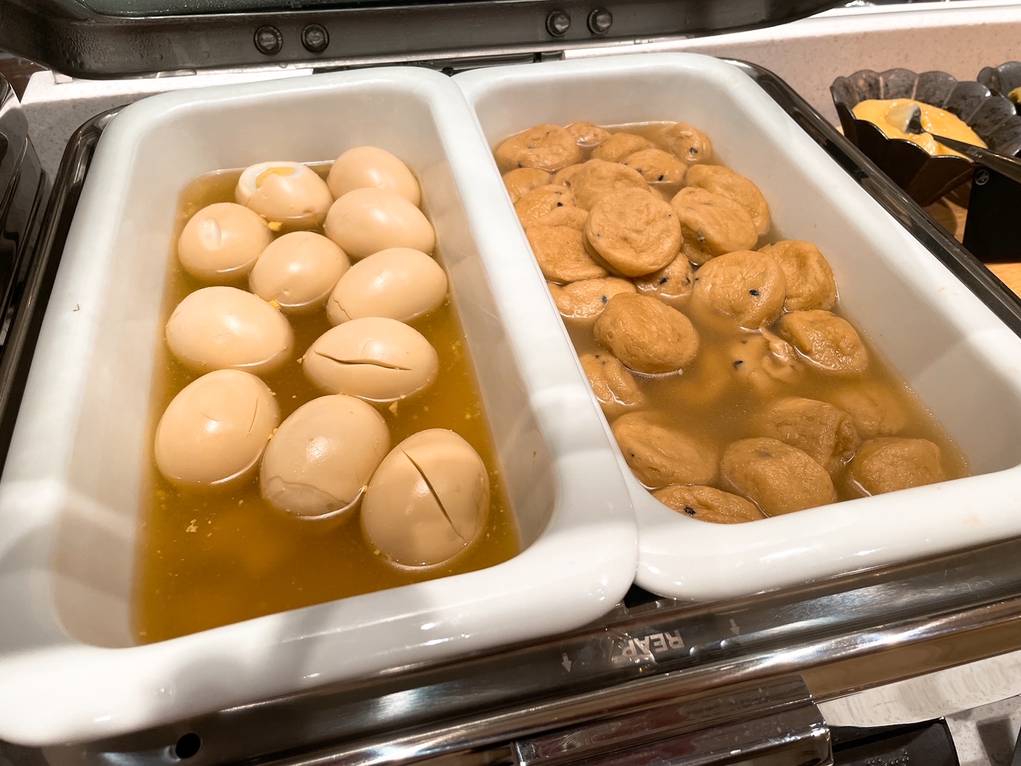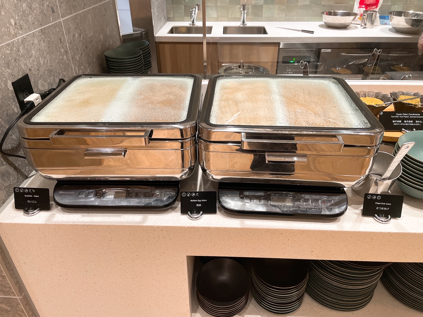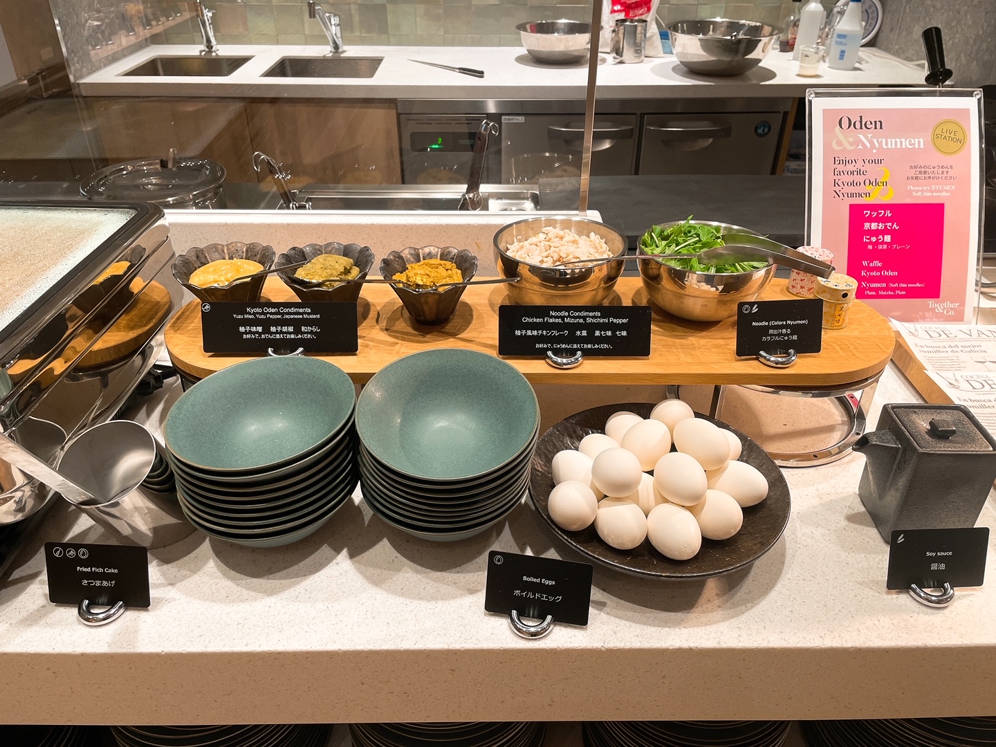 ヒルトン・ガーデン・イン京都四条烏丸Together&Co.朝食ブッフェですが、洋食はホテル朝食ブッフェでよく見かける定番メニューが中心ですが、和食は京都らしいおばんさいやちらし寿司、おでん、にゅう麺と特徴的です。朝食ビュッフェ全メニューをご紹介します。