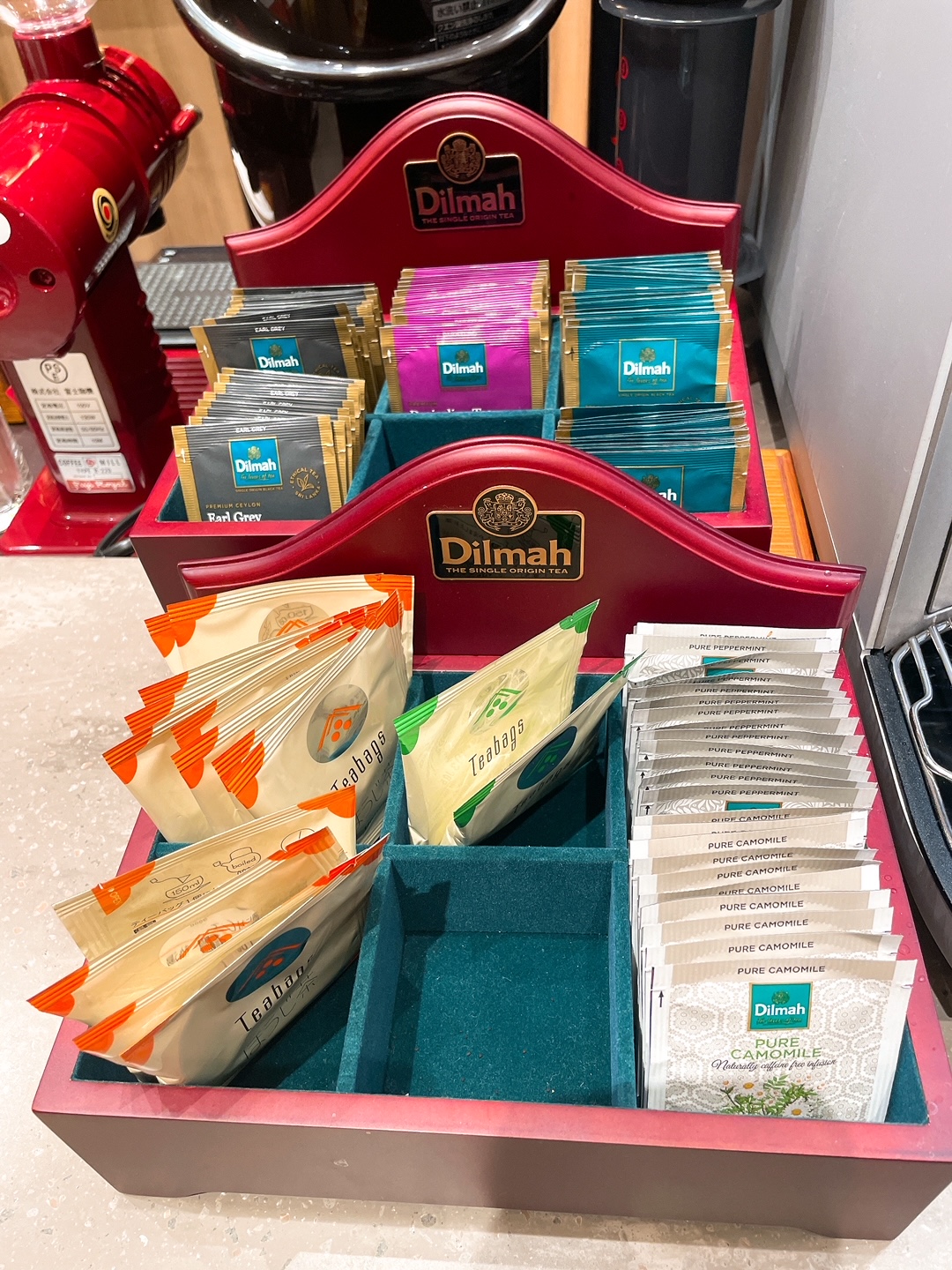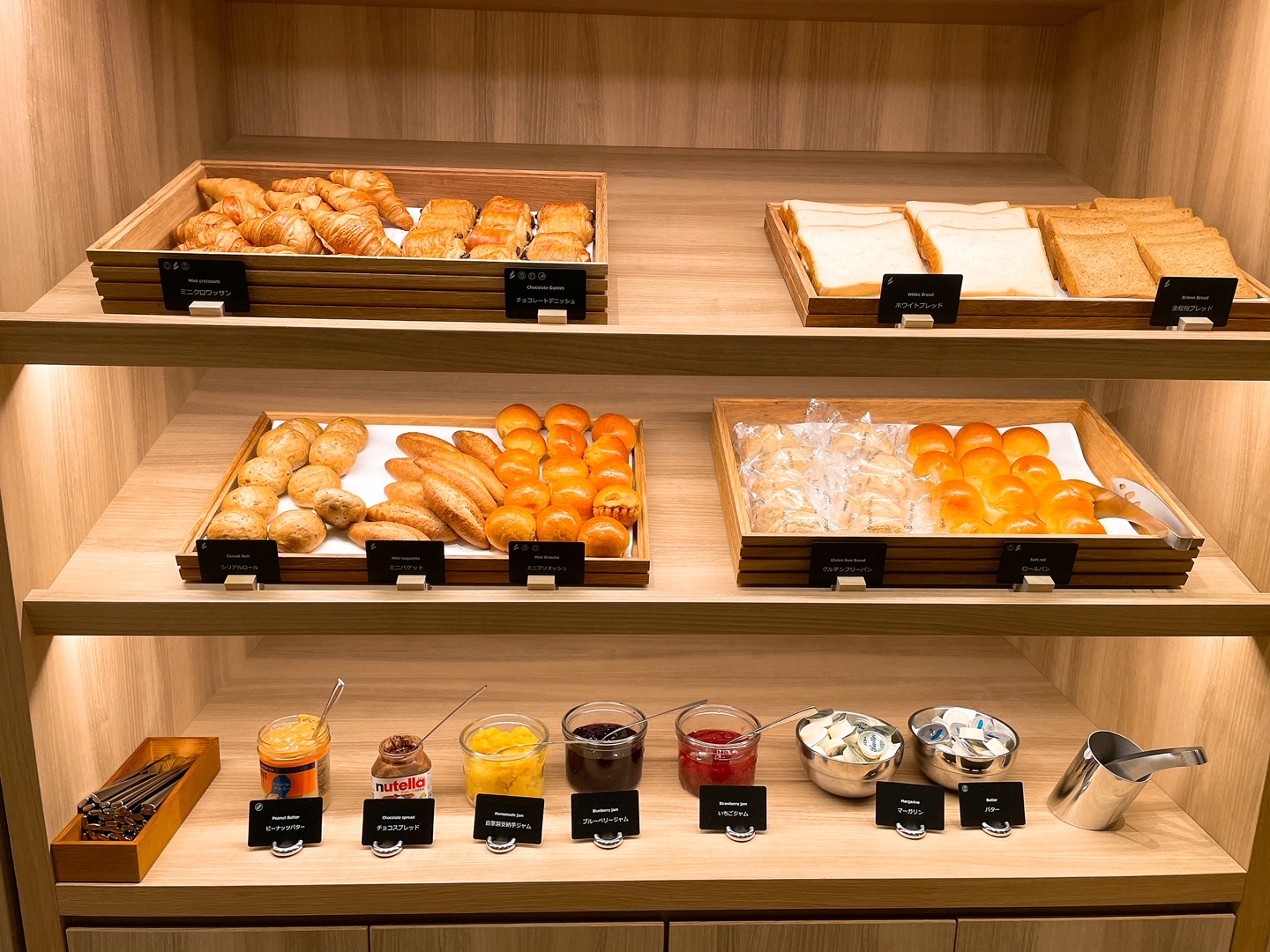 ホワイトブレッド、全粒粉ブレッド、ミニクロワッサン、チョコレートデニッシュ、シリアルロール、ミニバケット、ミニブリオッシュ、グルテンフリーパン、ロールパン、バター、マーガリン、いちごジャム、ブルーベリージャム、自家製安納芋ジャム、チョコスプレッド、ピーナッツバター