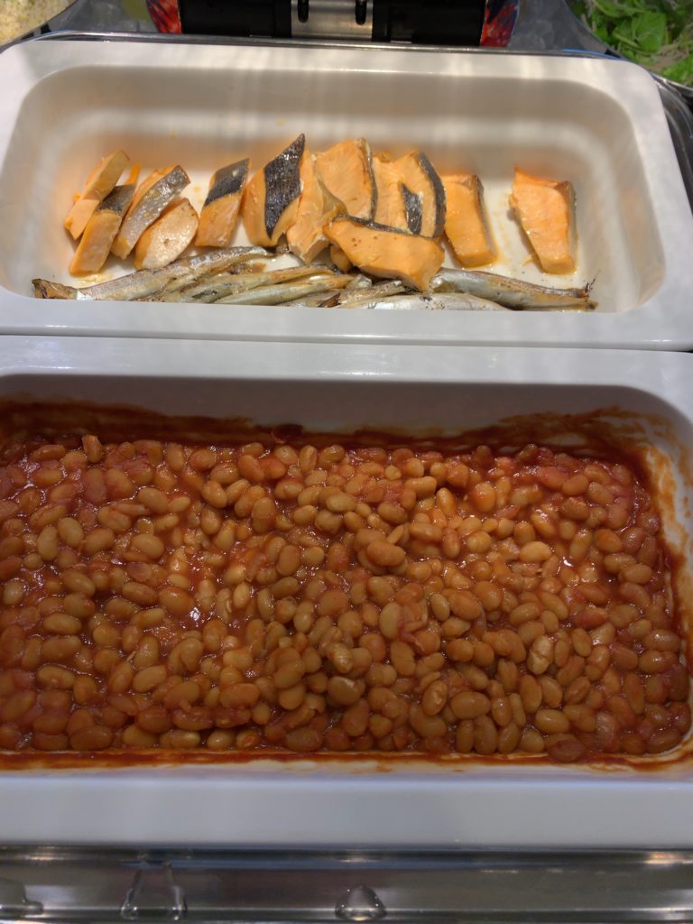 焼魚2種(鮭・ししゃも)、豆の煮込み