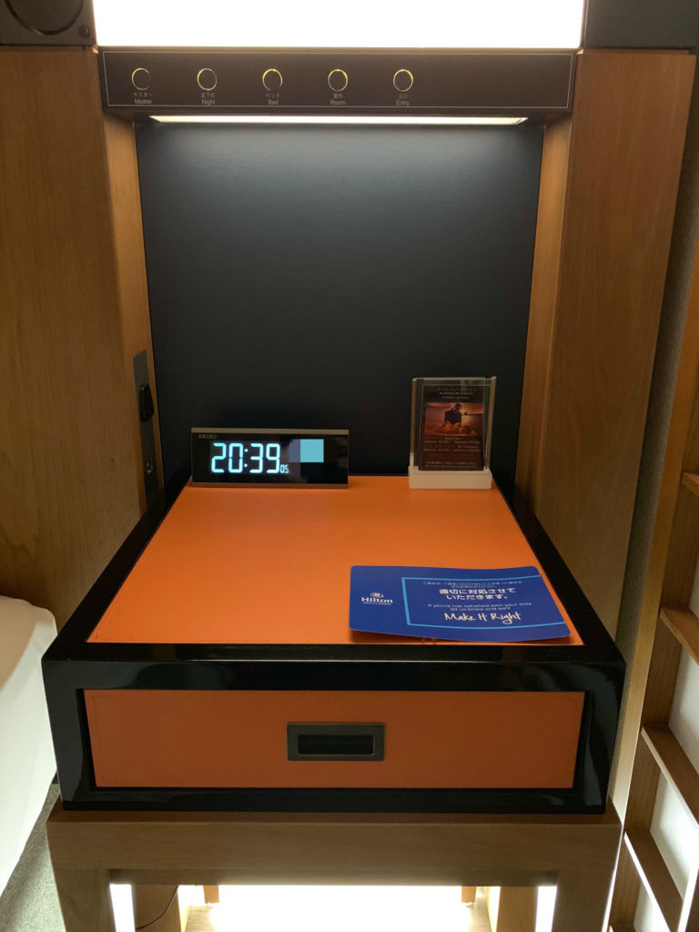 反対側の枕元には時計と引き出し。引き出しの中は空でした。