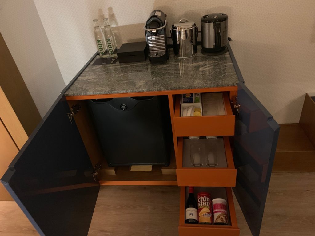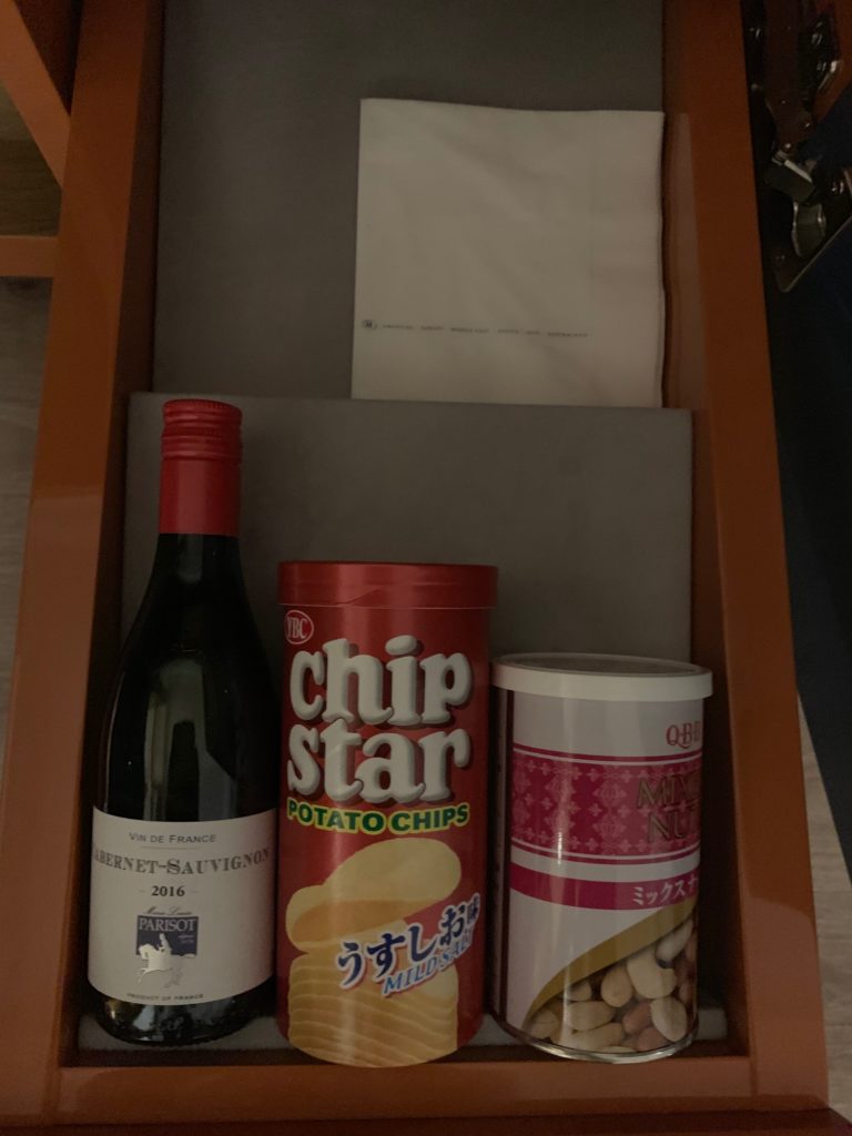 引き出し下段にはミニバーのワインとポテトチップス、ミックスナッツ