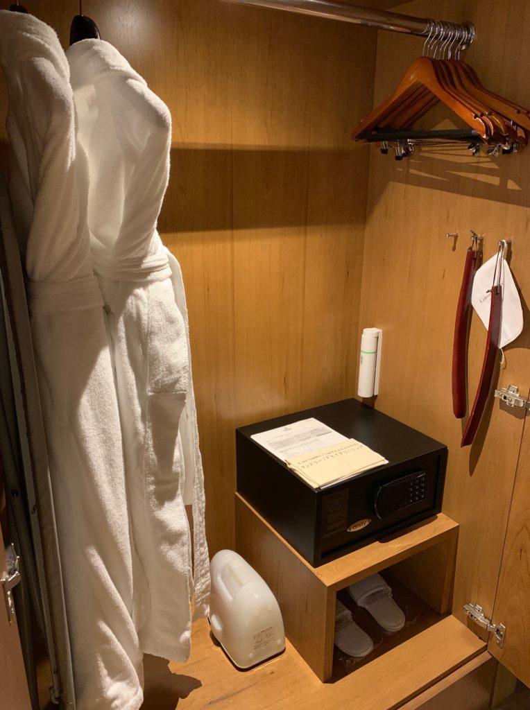 クローゼットの中にはバスローブがかかっています。ハンガーの数も十分、またセーフティーボックスやアイロンもあります。