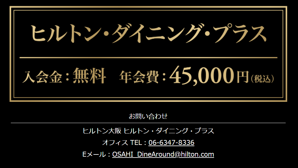 ヒルトンダイニングプラスとはヒルトンのレストラン割引や特典券が利用できる有料会員制度で、日本では「ヒルトン大阪」のみが対象となっているようです。今回は割引価格で1年お試しできますよという勧誘の電話がかかってきましたので内容を詳しく調べてみることにしました。