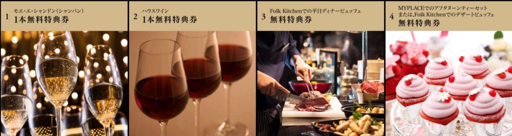 ・本特典券は、ヒルトン・ダイニング・プラス会員特典のレストラン25%割引と併用できます。4. MYPLACEでのアフタヌーンティーセットまたは、Folk Kitchenでのデザートビュッフェ無料特典券