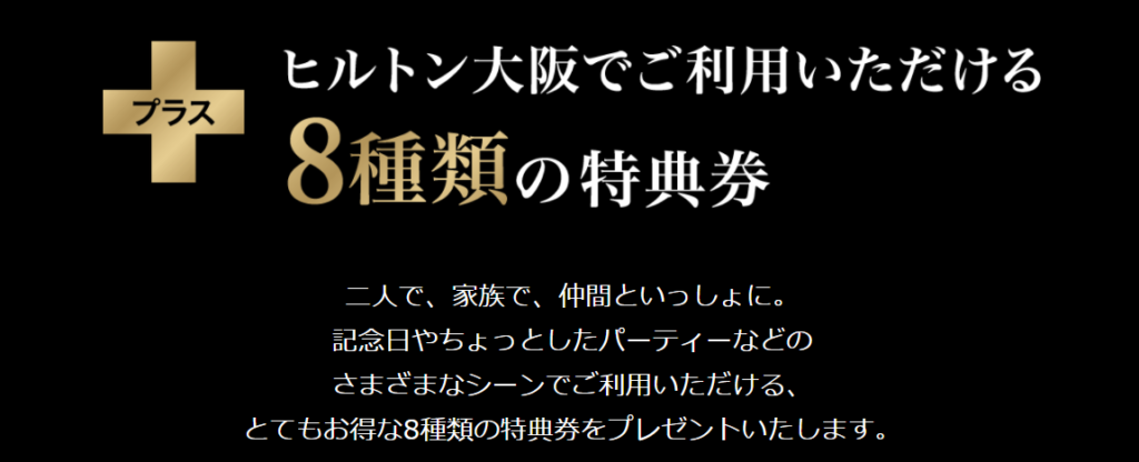 ヒルトン大阪で利用可能な8種類の特典券がもらえます。特典券の内容を1つずつチェックしていきます。