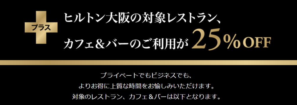 ヒルトン大阪の対象レストラン、カフェ&バーの利用が25%OFFとなります。
