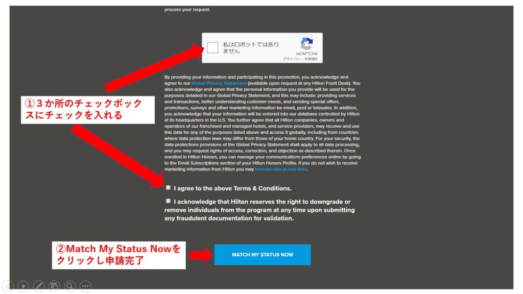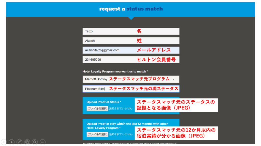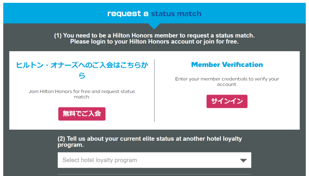 今回はヒルトンに数滞在する予定ですのでステータスマッチを申請することにしました