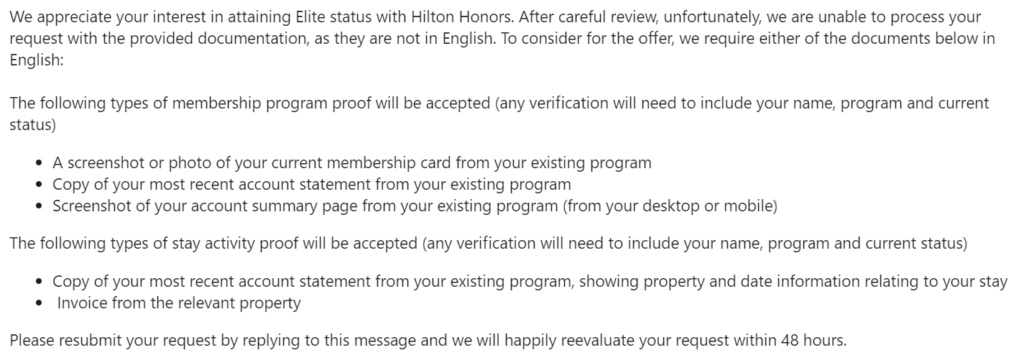 We appreciate your interest in attaining Elite status with Hilton Honors. After careful review, unfortunately, we are unable to process your request with the provided documentation, as they are not in English. To consider for the offer, we require either of the documents below in English: