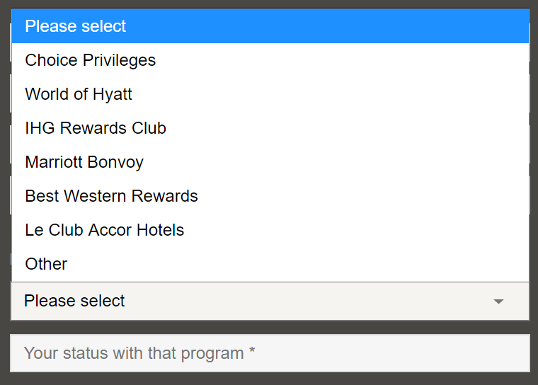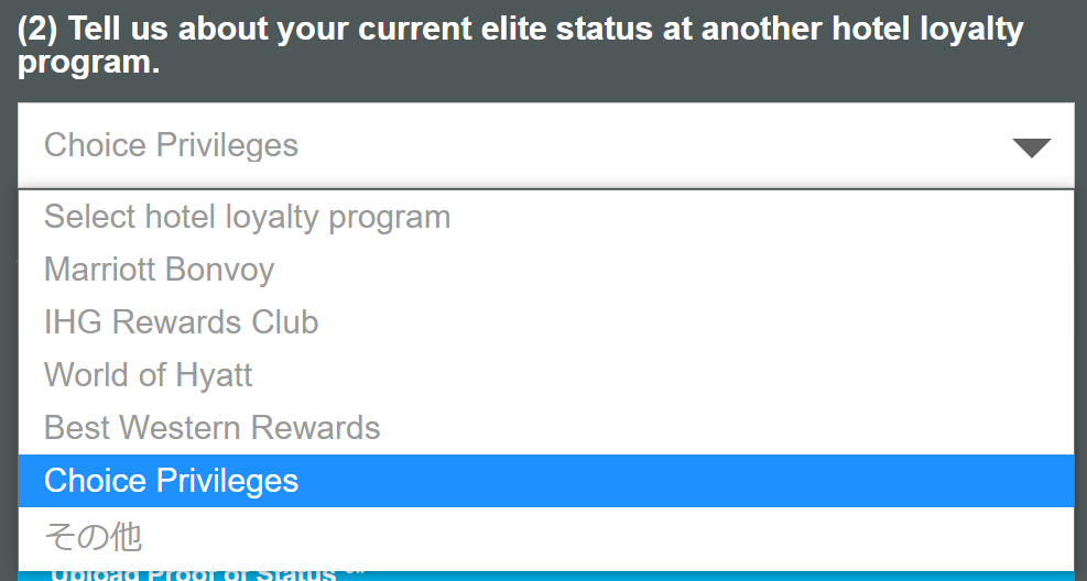 選択できるのはChoice、Hyatt、IHG、Marritt、Best Western、Accorとなっています。Otherもありますので他のホテルプログラムでも可能ではあるでしょうが上記が無難と思われます。