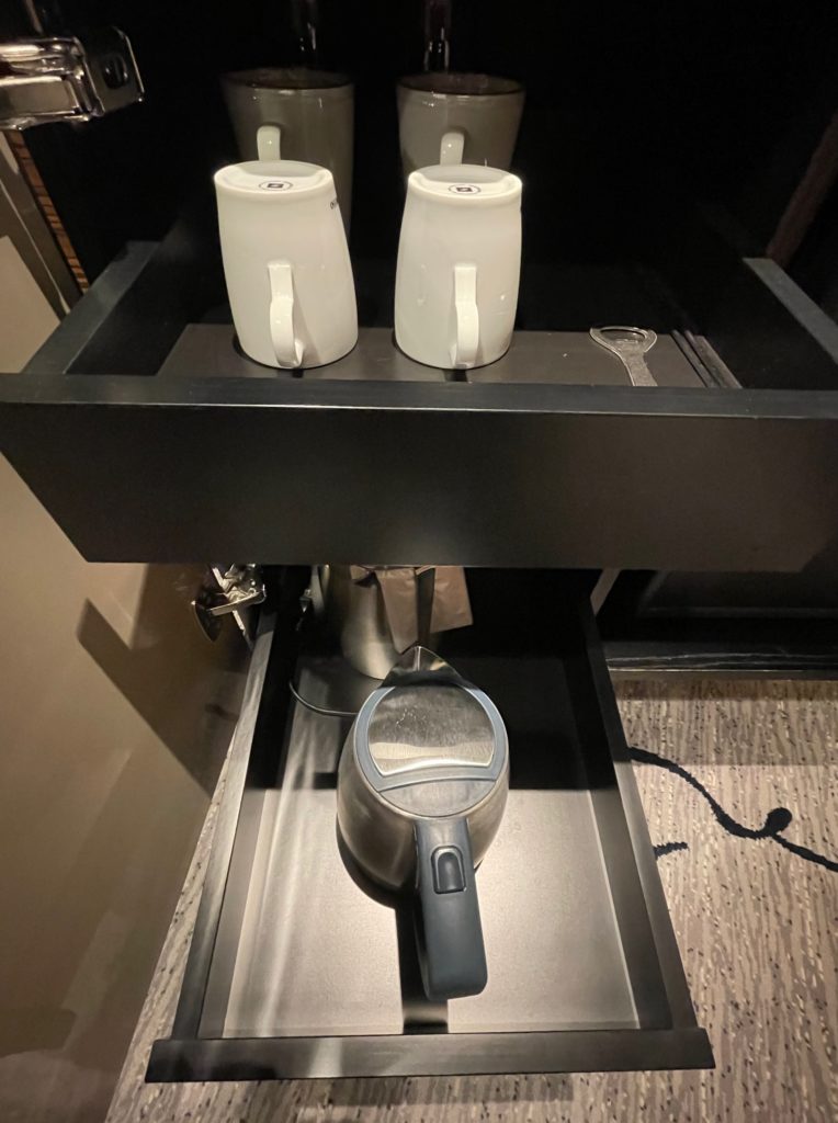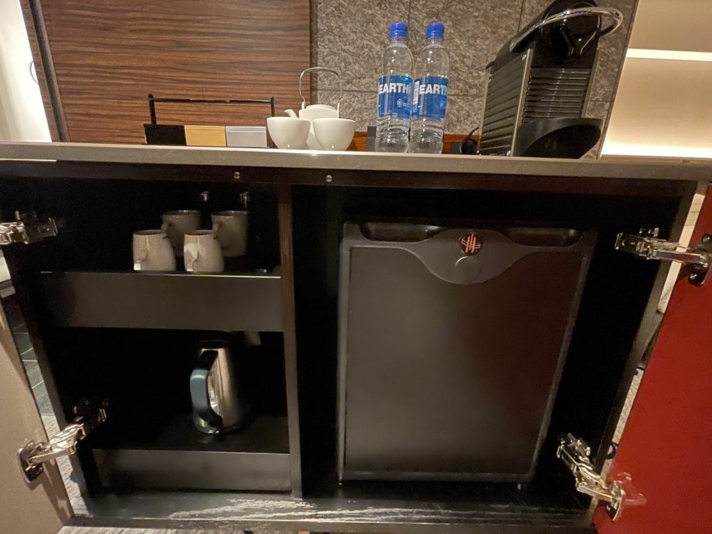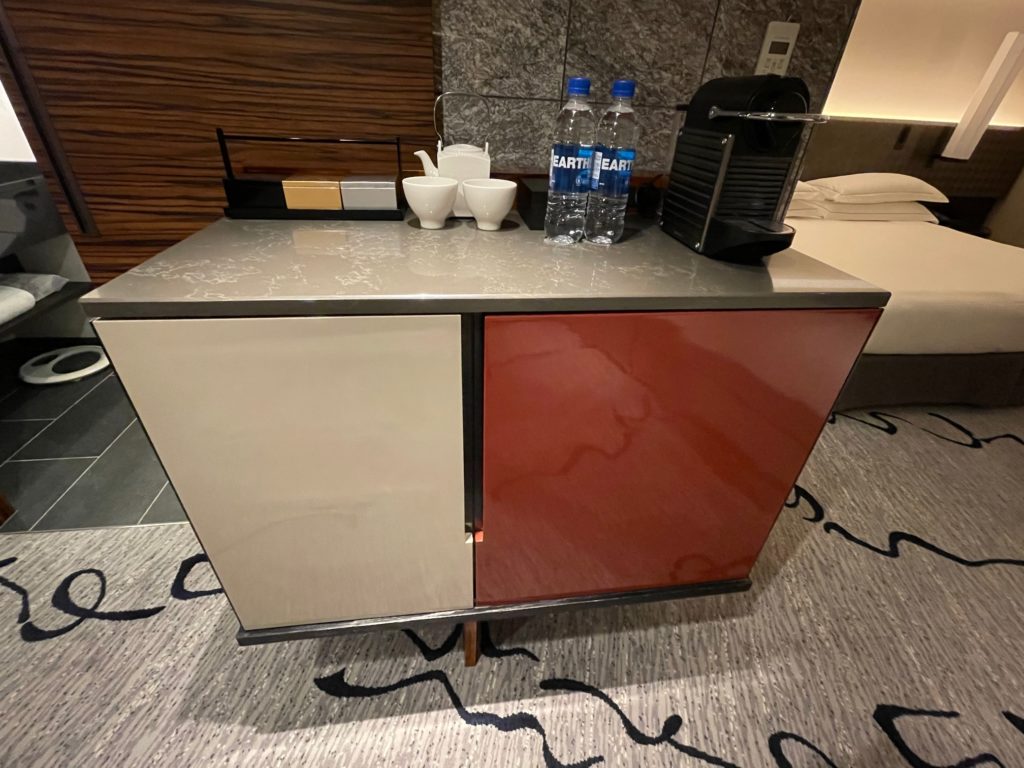 キャビネットの上には無料のミネラルウォーター2本、ネスプレッソ、急須と湯呑み、ネスカフェのスティック・煎茶のティーバッグ・Premier's Teaのティーバッグが入った箱(左側)が置かれています。