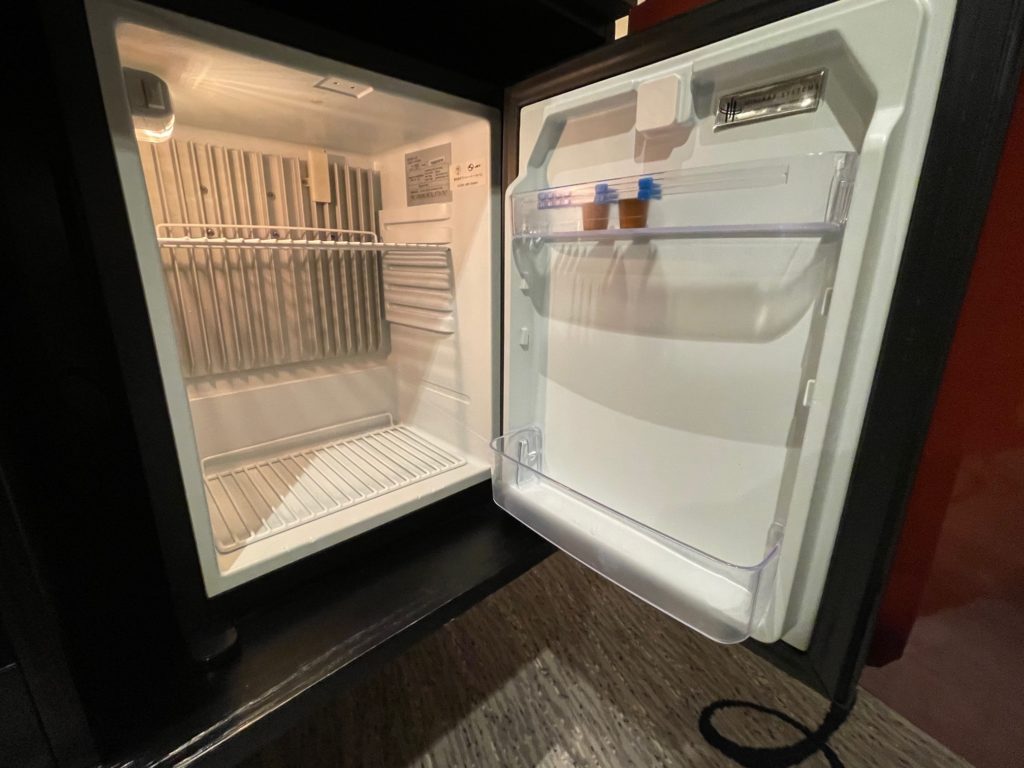 キャビネットの扉を開けると左側には冷蔵庫、右側には引き出しがあります。