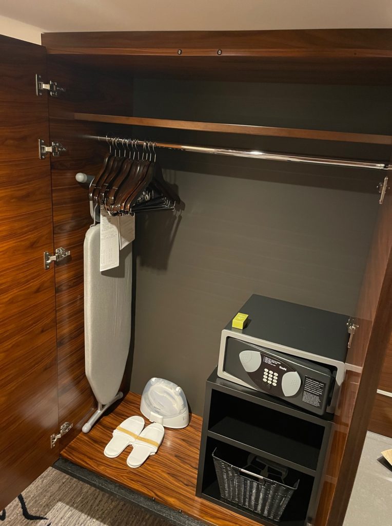 クローゼットの中にはアイロン、アイロン台、セーフティボックス、スリッパなど。ハンガーの数も十分です。
