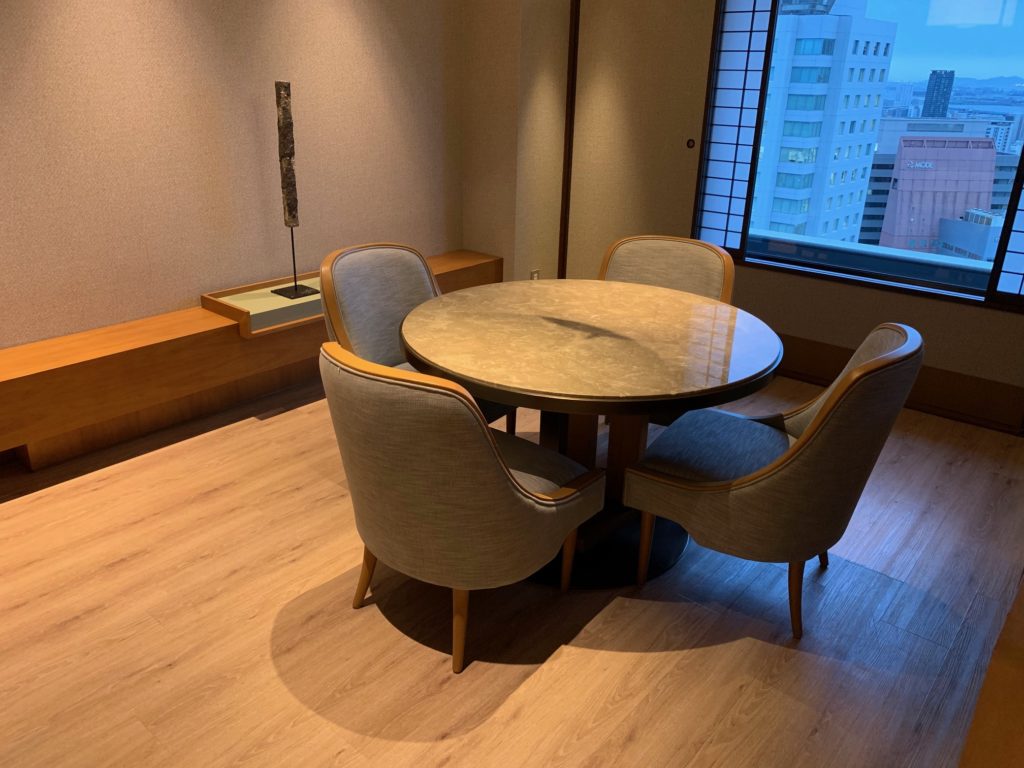 入口を入ると丸テーブルが見え、福島や淀川の景色が見えます。