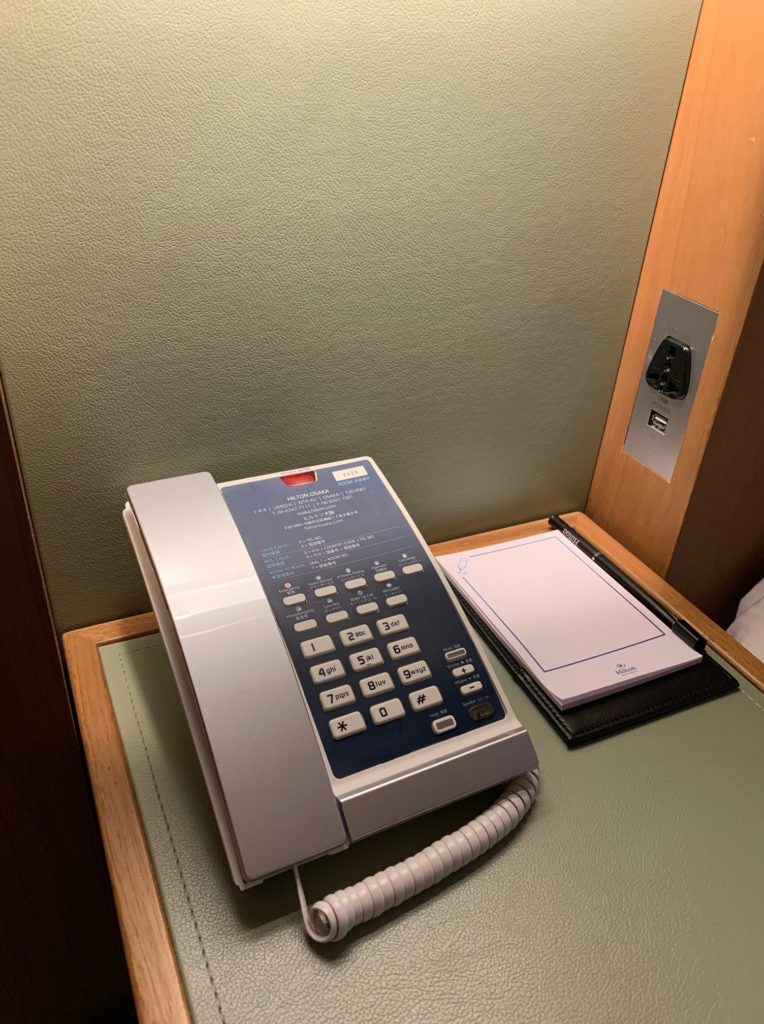 反対側には電話とメモ。電源はマルチコンセントとUSBコンセント。