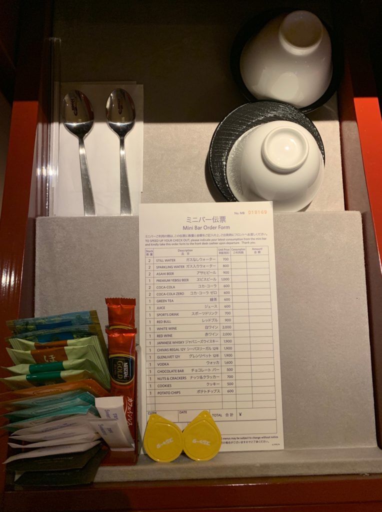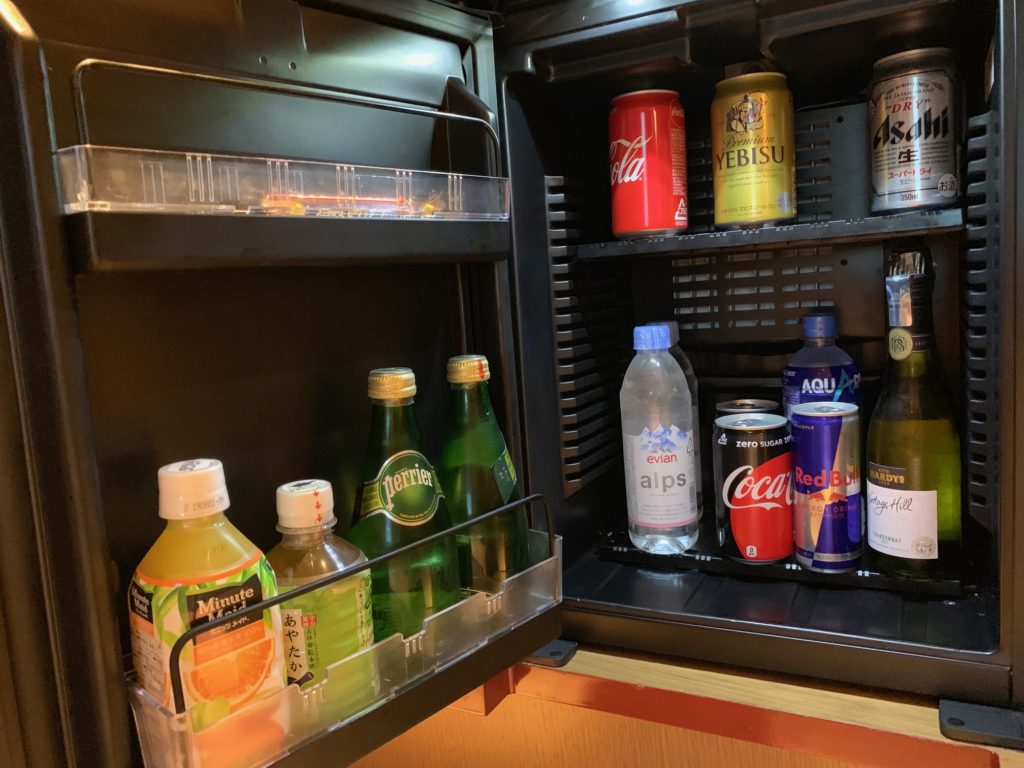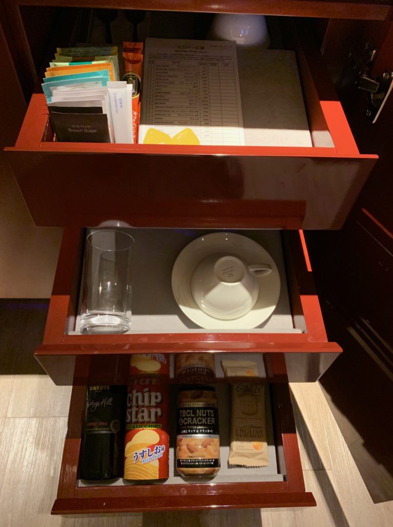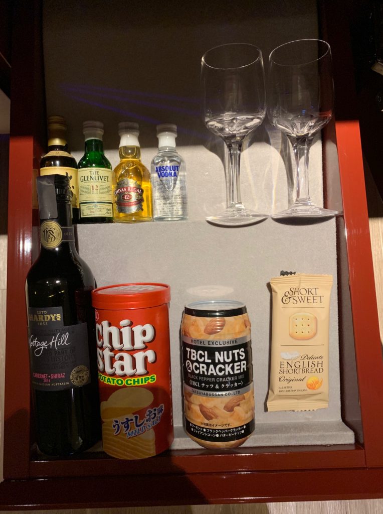 下段はミニバーのハードリカーやおつまみ、グラスが入っています