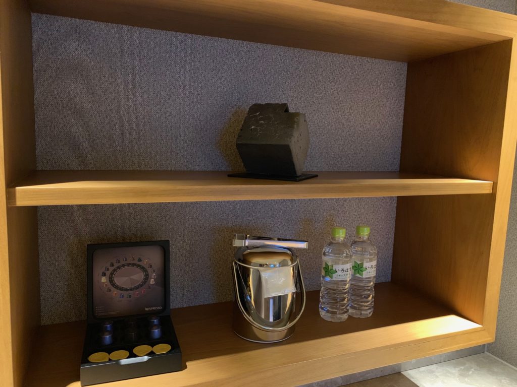 棚にはアイスペール、ネスプレッソ、無料のミネラルウォーターが置かれています