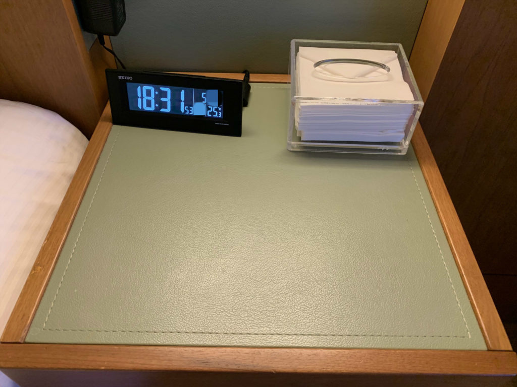 ベッドサイドには時計とティッシュ