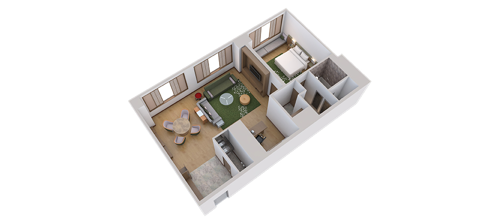 つらつらと説明しましたが分かりにくいので間取りを立体的に表現したものを挙げておきます。ただこの画像はベッドルームが入り口入って左側でなくテレビの裏側と逆にあります。こういう間取りもあるんですね~