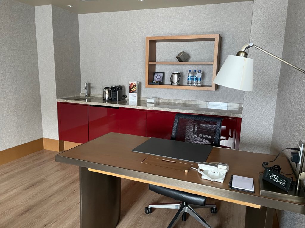 テレビを正面に右手にはミニキッチンとビジネスデスクがあります。棚にはアイスペール、ネスプレッソ、無料のミネラルウォーターが置かれています