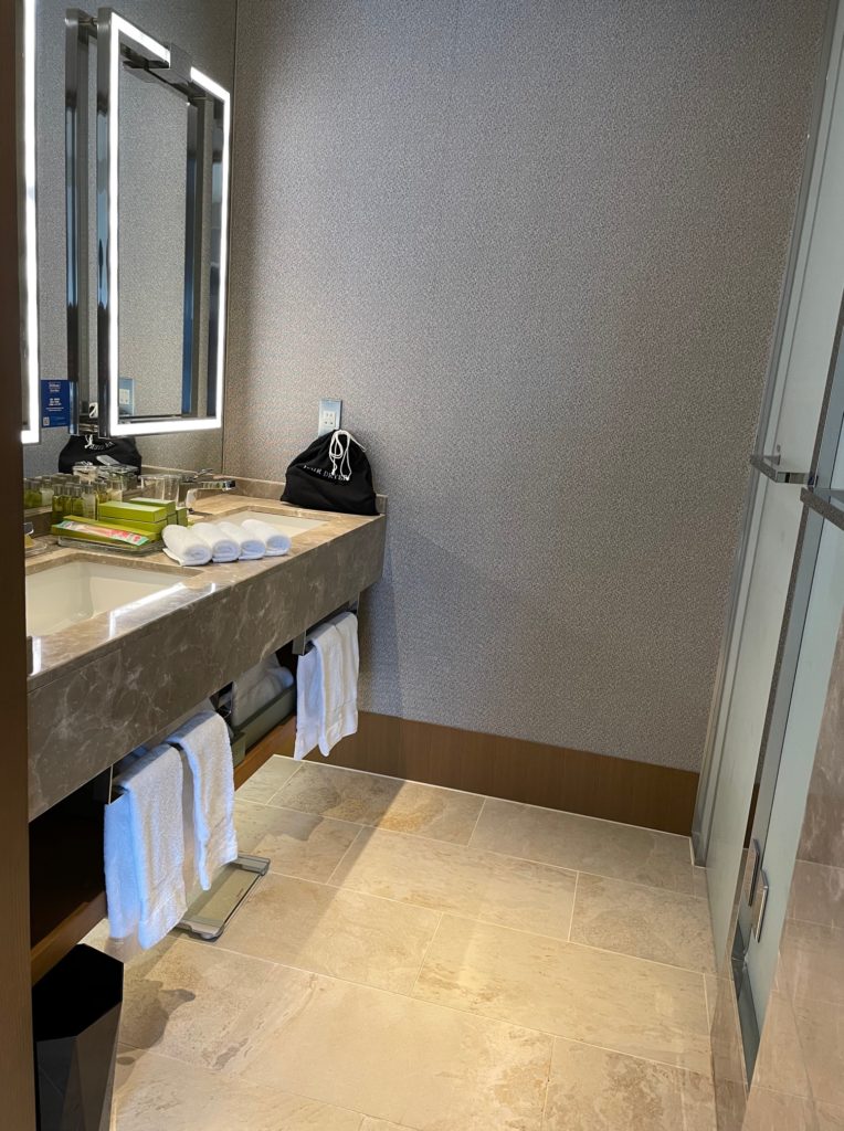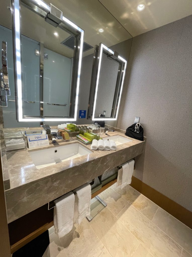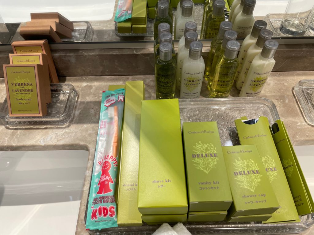 ダブルボウルにしてはちょっと手狭でモノがぎっしり並んでいます(^^;)アメニティはヒルトンおなじみのクラブツリー&イヴリン。子供用の歯ブラシも置かれています。