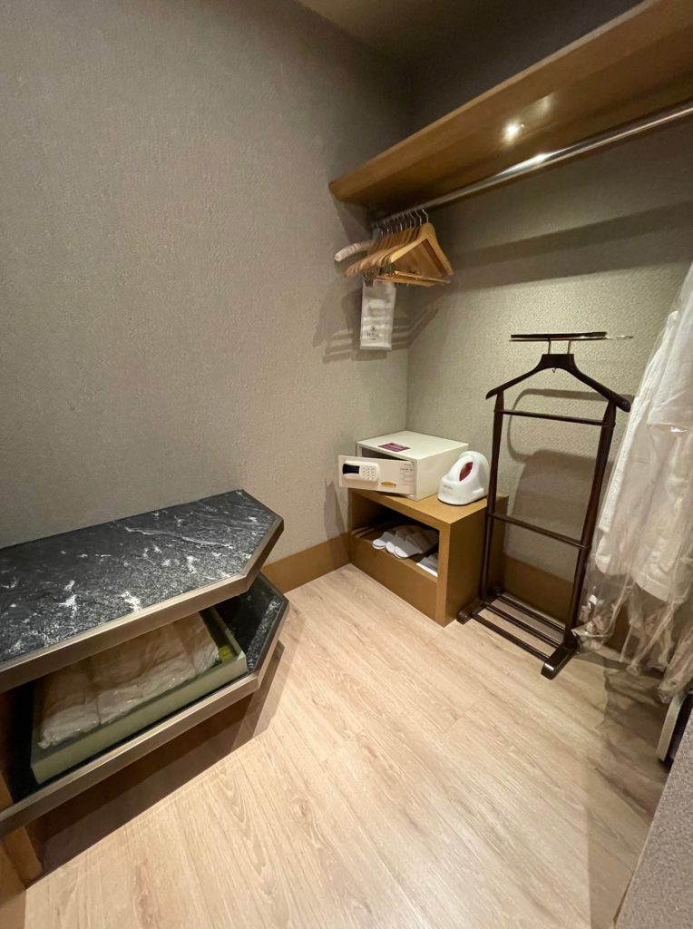 ウォークインクローゼットはかなり広いです。ハンガーの数も多く、バスローブがかかっています。