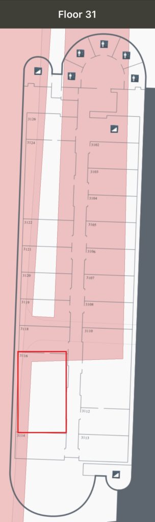 今回宿泊したのは31階3116号室です。エグゼクティブスイートルームは90㎡あるようです。フロアマップを見てお分かりのように他の部屋の3部屋分の広さがあります!