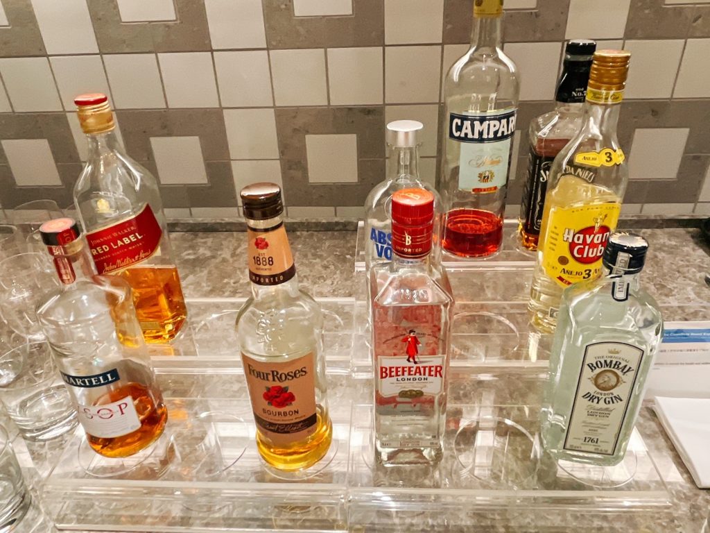 ジャックダニエル ブラック、ジョニーウォーカー レッドラベル、フォアローゼズ、マーテル、カンパリ、ボンベイ ドライジン、ビーフィーター ジン、アブソルート ウオッカ、ハバナクラブ