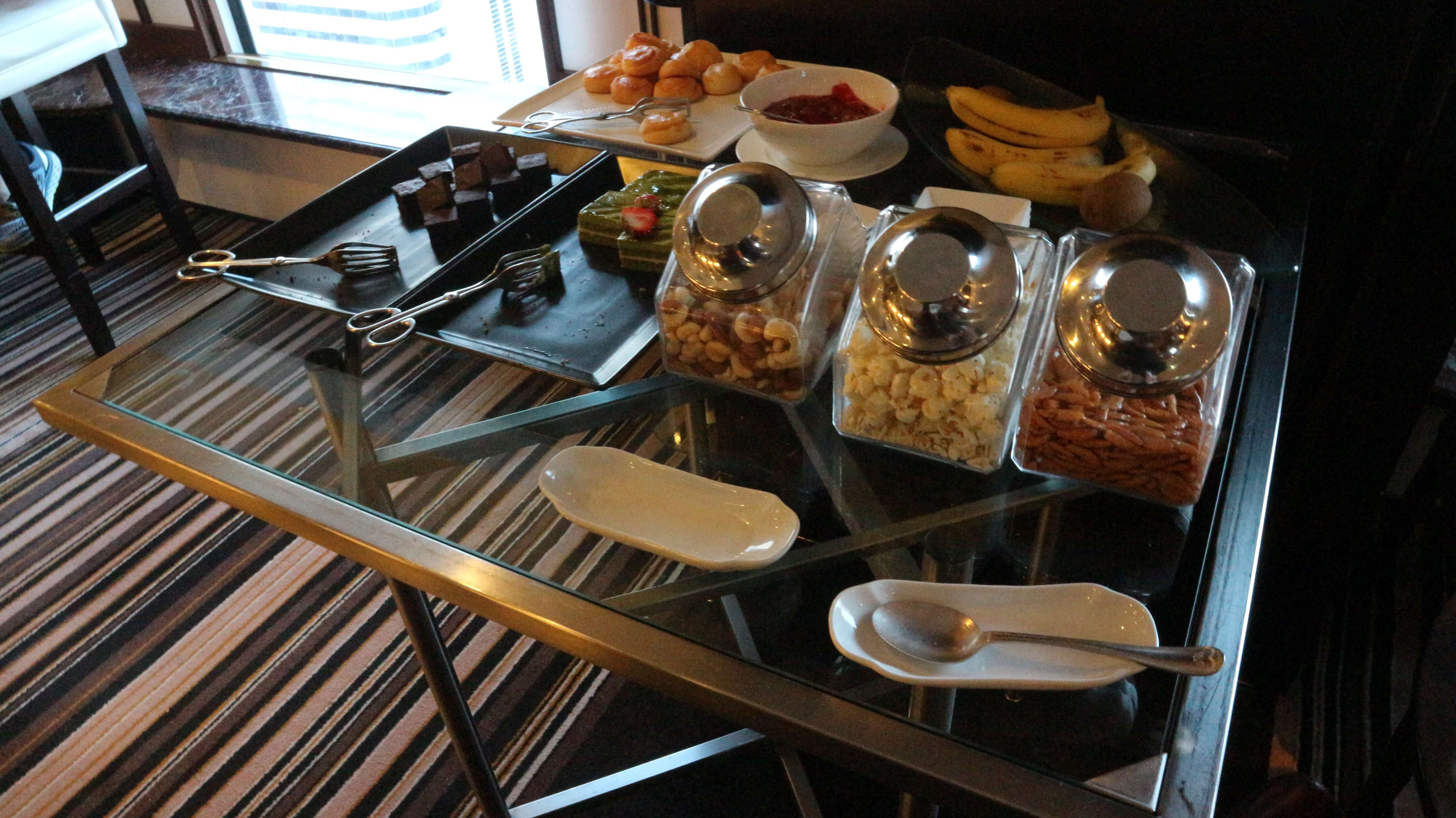 エグゼクティブラウンジの営業時間のうち朝食・アフタヌーンティー・カクテルタイムに当てはまらない時間があります。おさらいしておくと朝食は6:00~10:00、アフタヌーンティーは15:00~17:00、カクテルタイムは18:00~20:00となっていますので10:00~15:00、17:00~18:00、20:00~21:00はサービス内容が案内されていません。