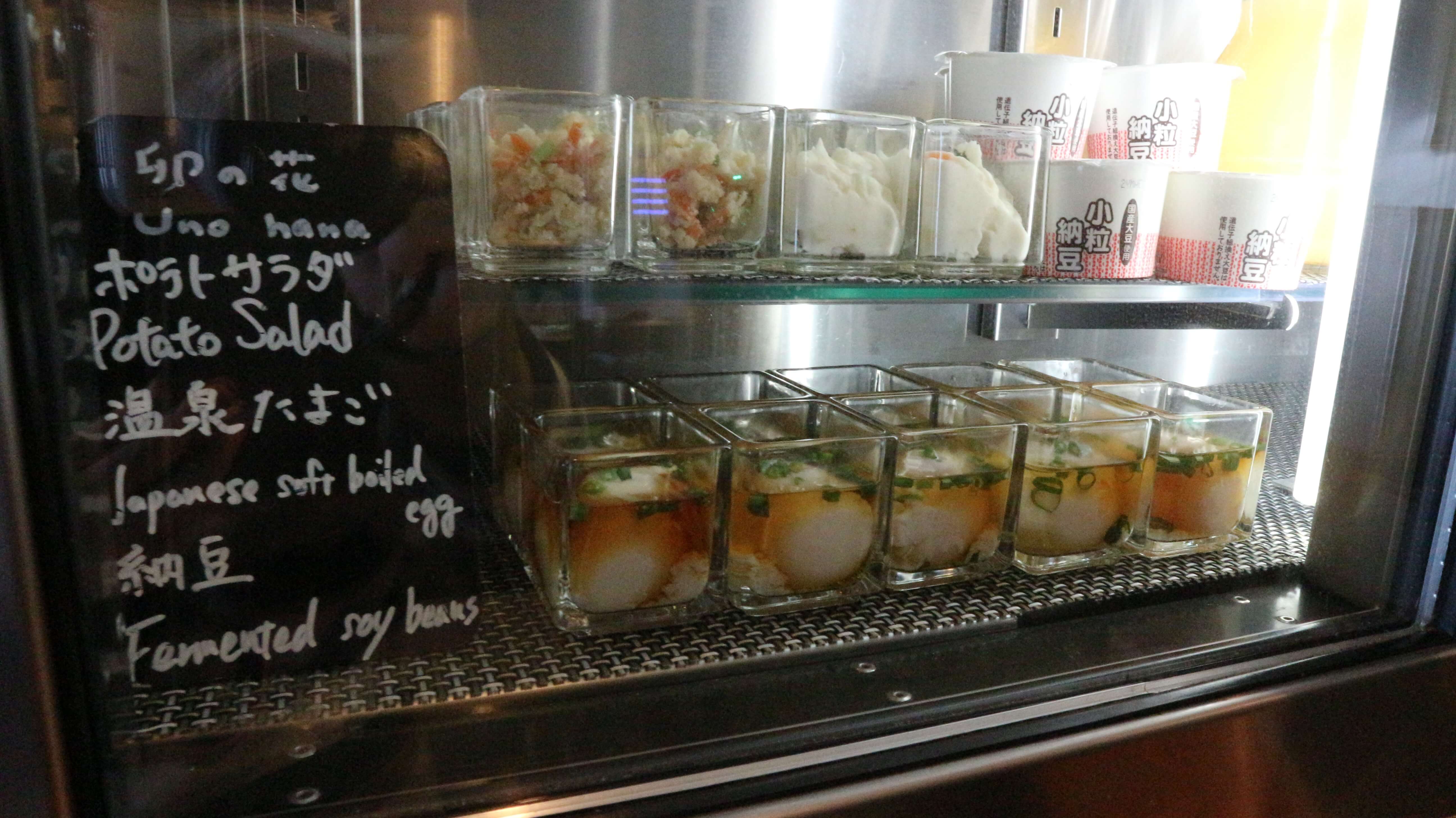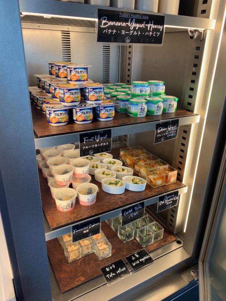 上段の冷蔵ケースにはオレンジジュース、グレープフルーツジュース、チョコレートミルクといった飲み物とともに卯の花、ポテトサラダ、温泉卵といった小鉢や納豆が並んでいます