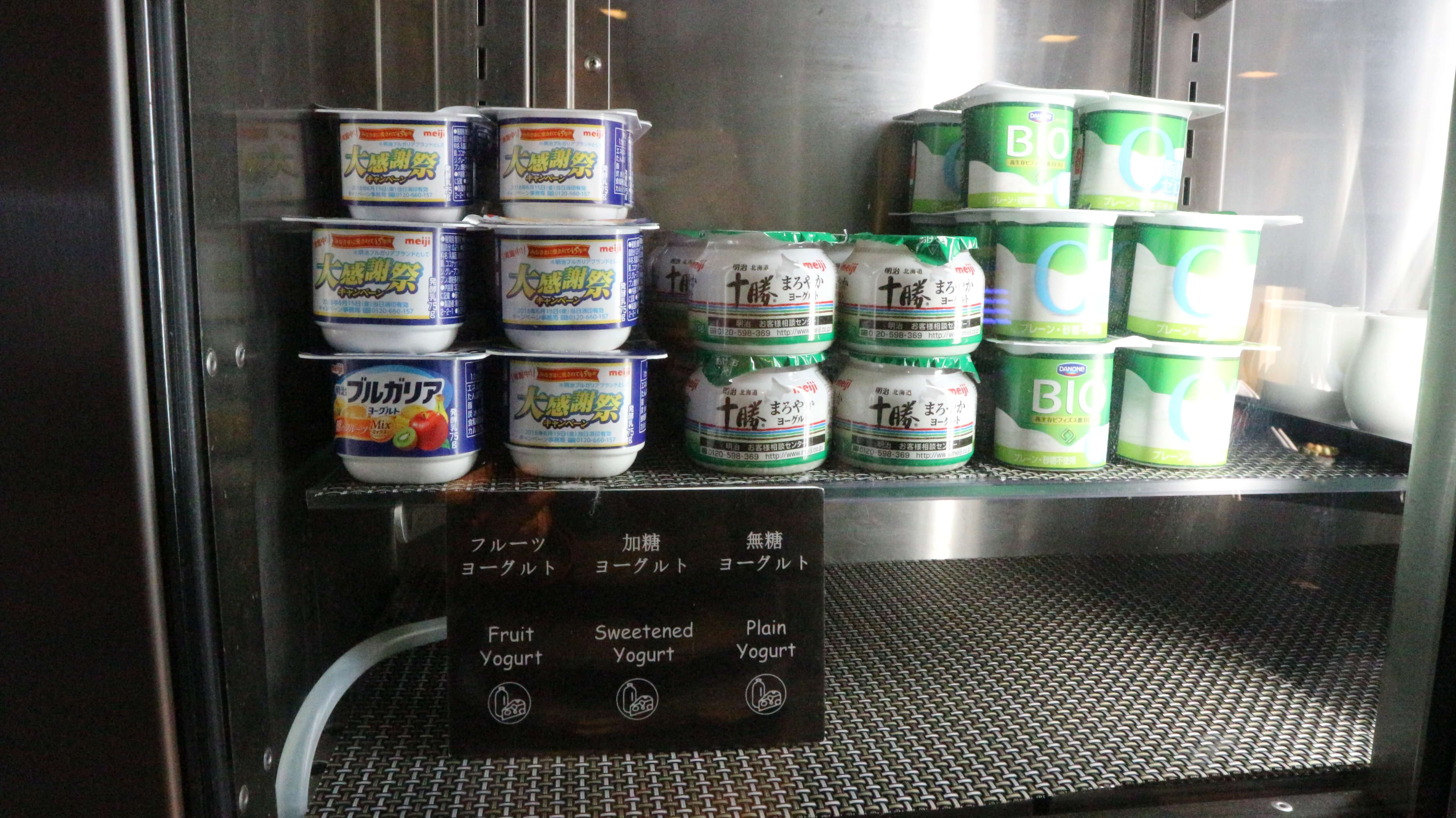 上の冷蔵ケースにはカップヨーグルトが3種類入っています。