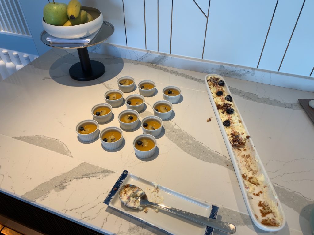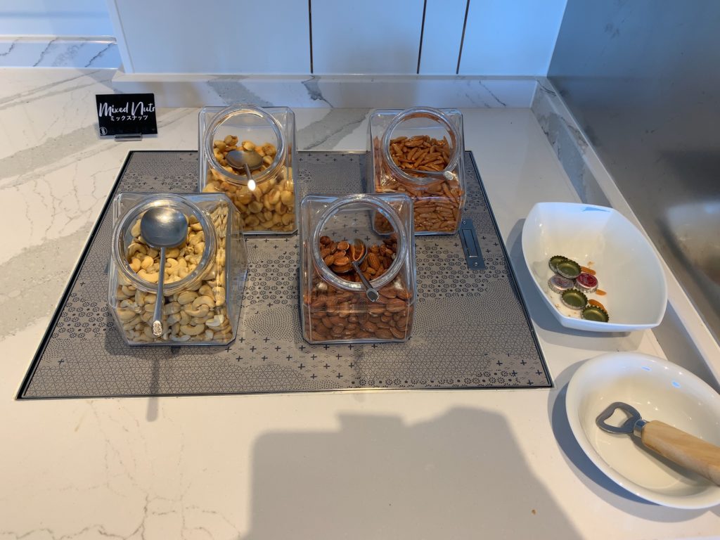 カウンターの向かいにはアフタヌーンティー時間帯にあったスコーンやケーキなどのスイーツや、ポップコーンや柿の種といったおつまみが残されています。