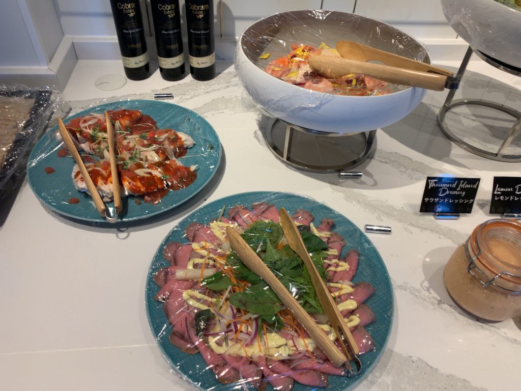 チキンサラダサルサソース、ローストビーフカレーマヨネーズ、キャロットアップルヨーグルトサラダ