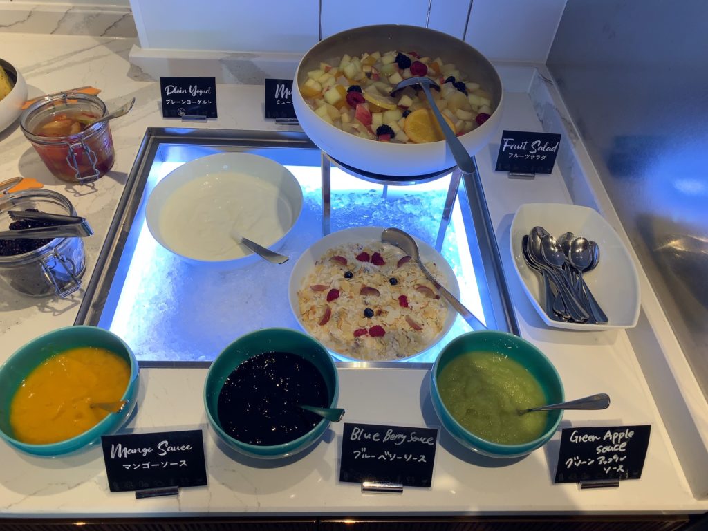 プレーンヨーグルト、ミューズリー、フルーツサラダ、ソース3種(マンゴー・ブルーベリー・グリーンアップル)