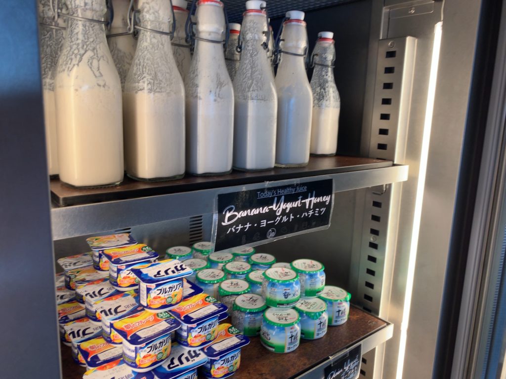 冷蔵ケースのカウンターにはシリアル類とバナナが並んでいます。