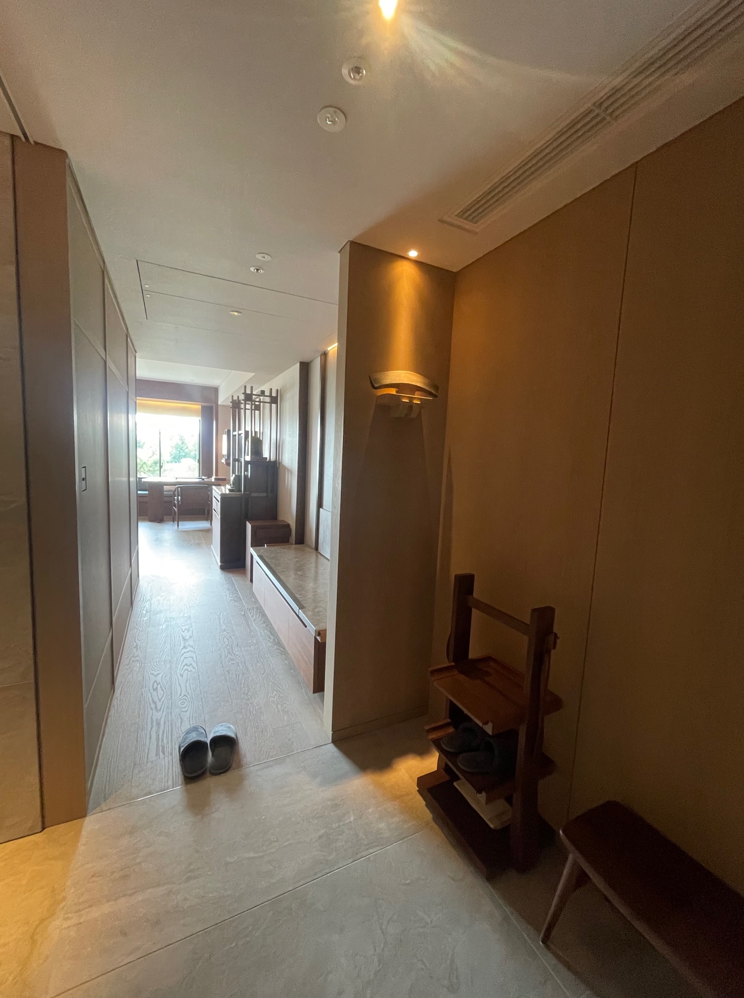 まず入り口を入ったところです。スリッパが置かれているのがお分かりいただけるかと思いますが、こちらのホテルは入り口で靴を脱いでスリッパに履き替えるスタイルになっています。