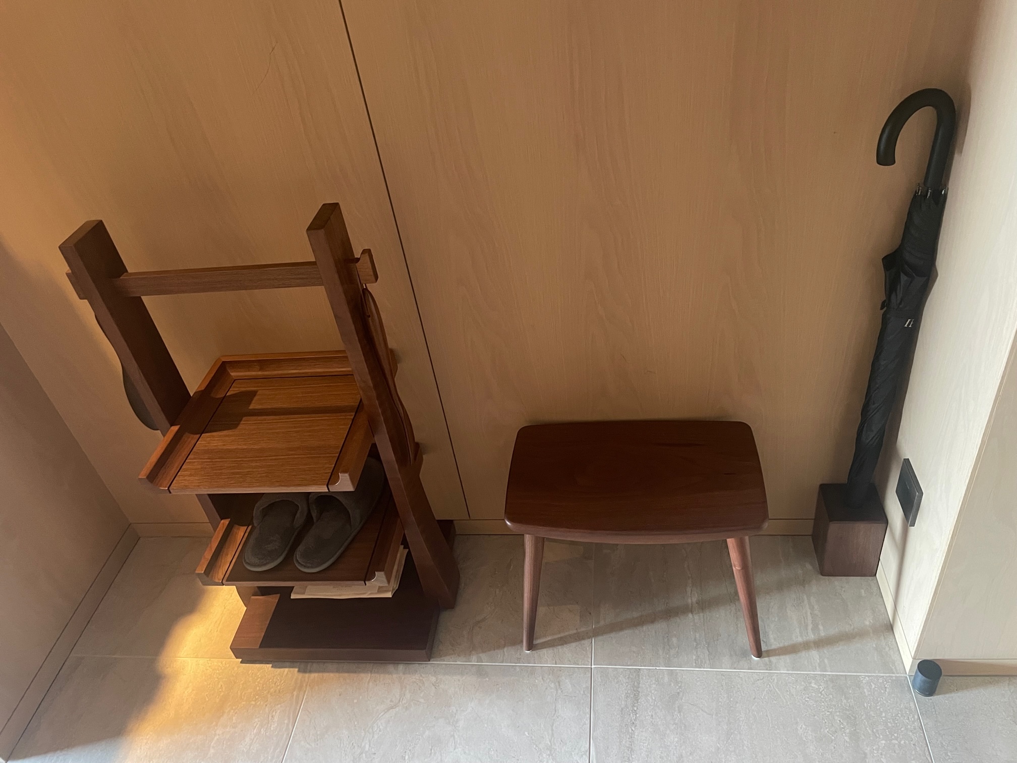 入ってすぐ右手には靴を履くときに座るスツールと靴を置く棚、傘が置かれています