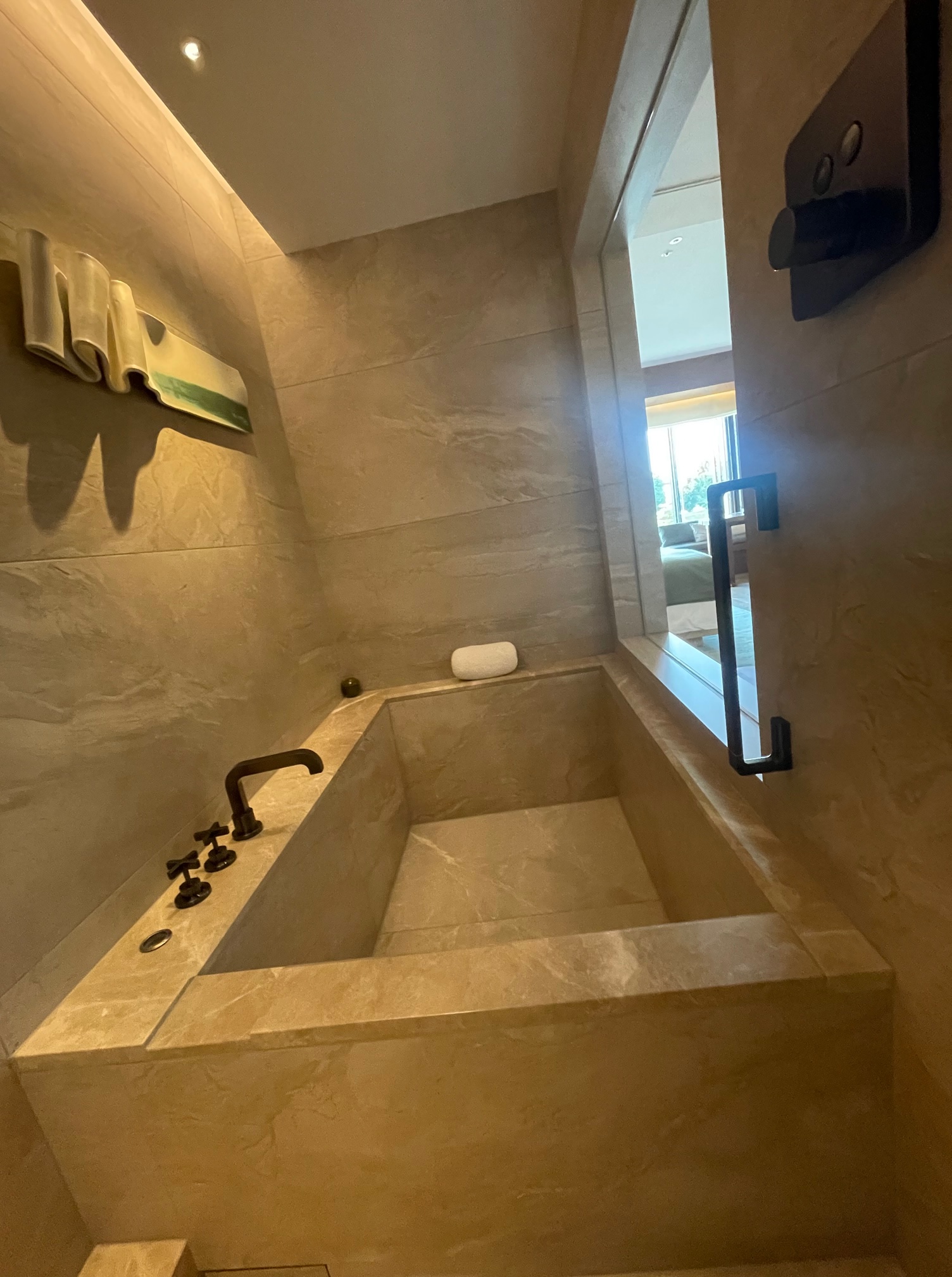 トイレの隣にあるバスルームは石造りでゆったりと足を延ばして入れます。奥にバスピローとバスソルトが置かれています。