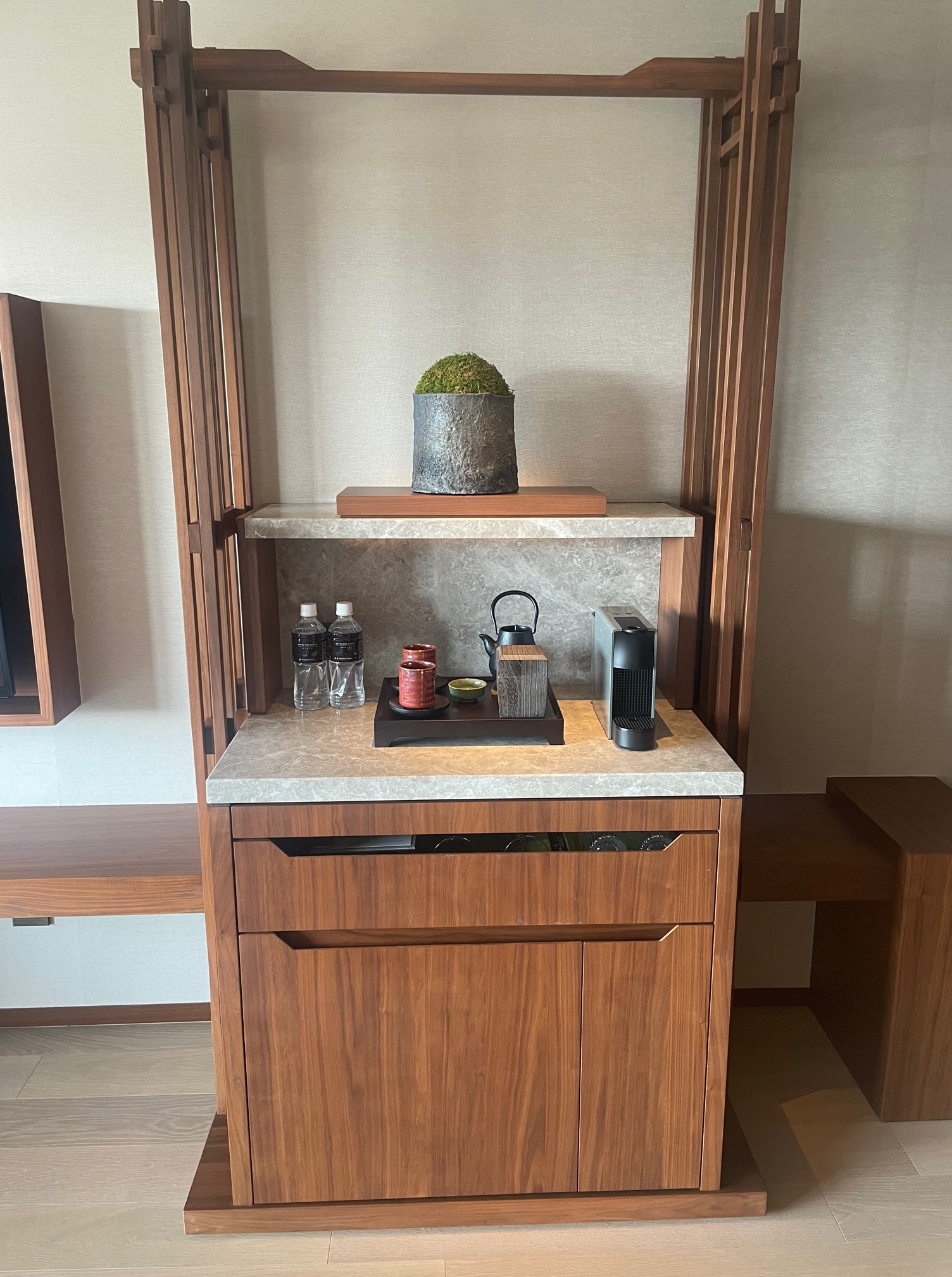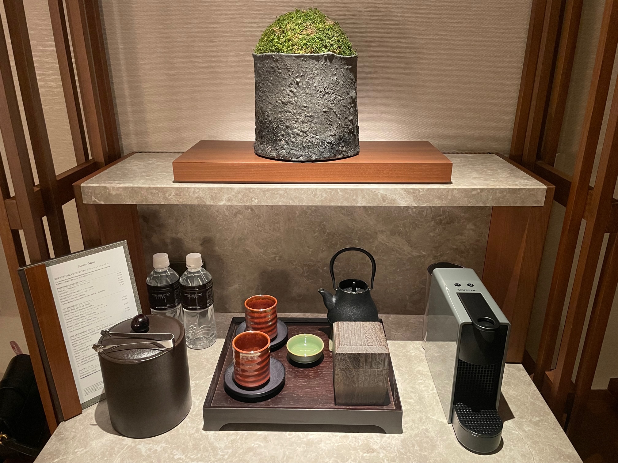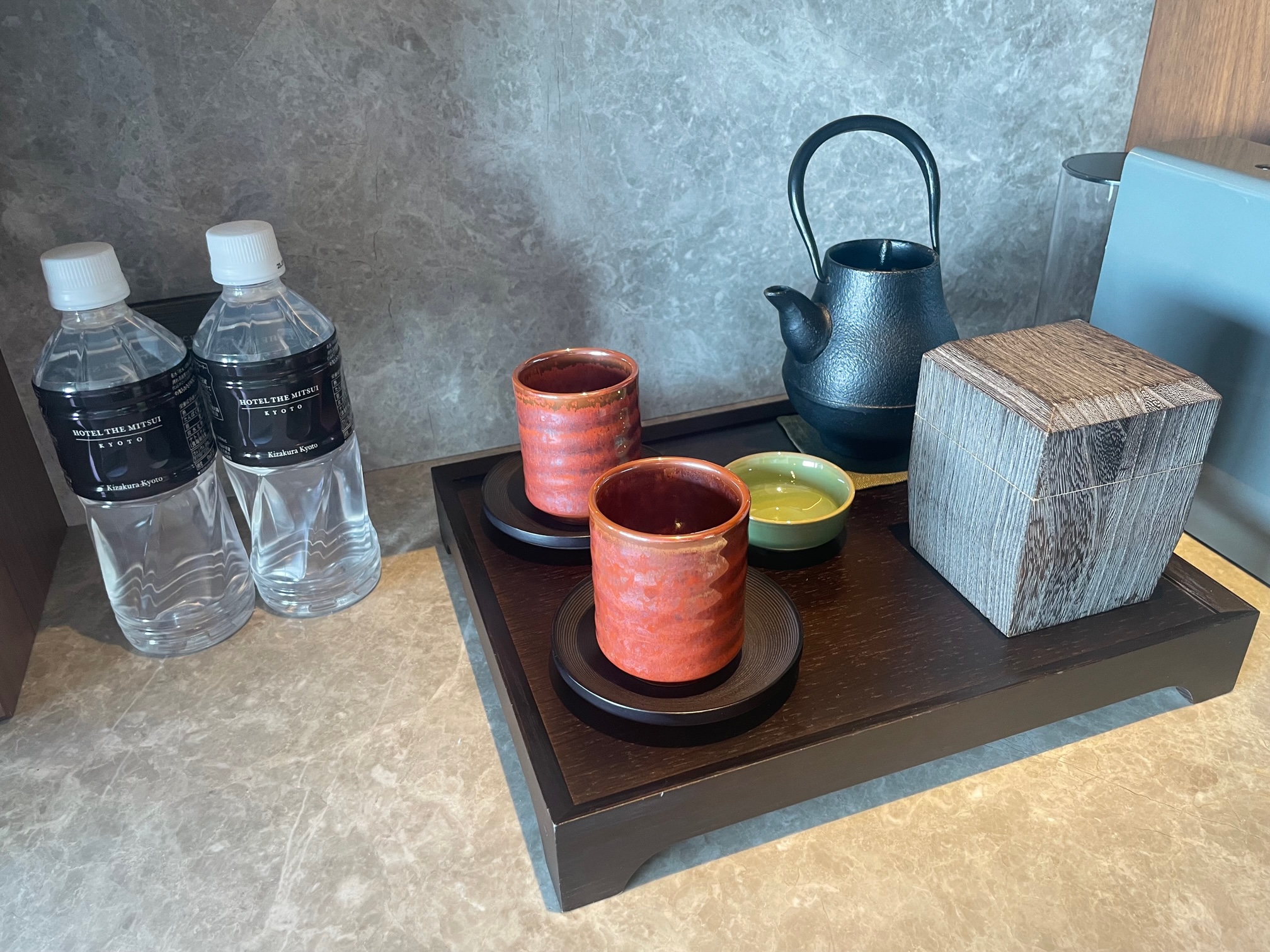 サービスのミネラルウォーター、ネスプレッソ、急須や湯呑みが置かれています。