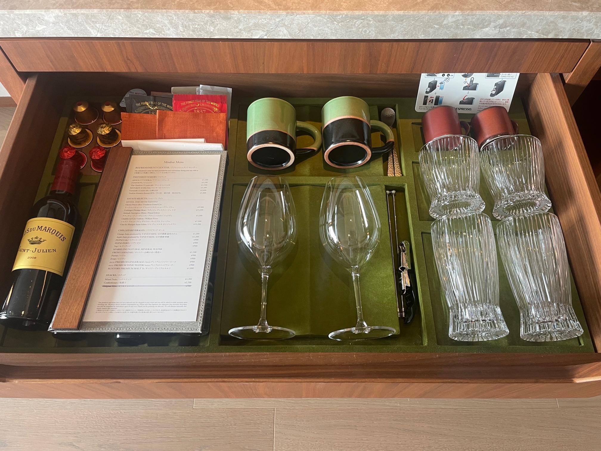 グラスやカップはデザインもよく上質のものが置かれています。ネスプレッソとTWGの紅茶は無料です。
