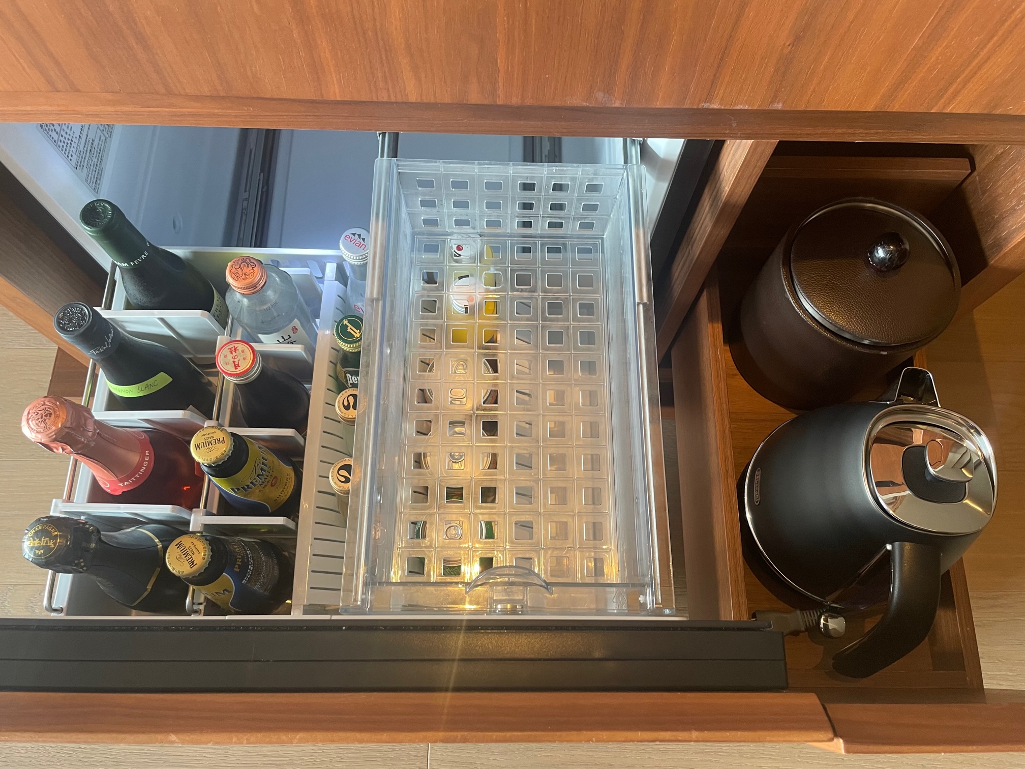 下段左側の冷蔵庫は引き出し式です。下段右側の引き出しにはデロンギの電気ケトルとアイスペールが入っています。