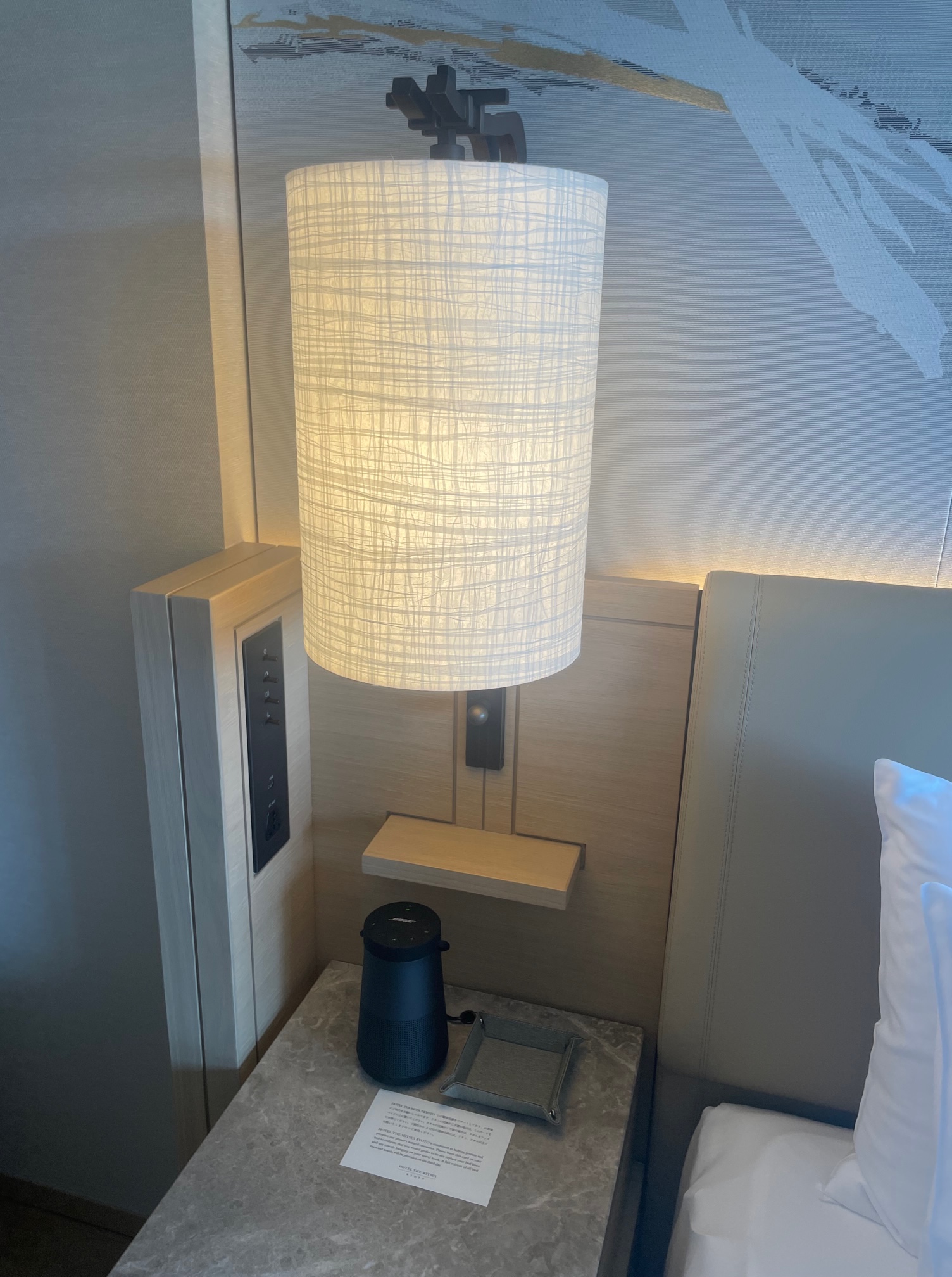 ベッドサイドにはBOSEのBluetoothポータブルスピーカーが置かれています。照明のスイッチとコンセント、USBコンセントがそれぞれ1口ずつあります。