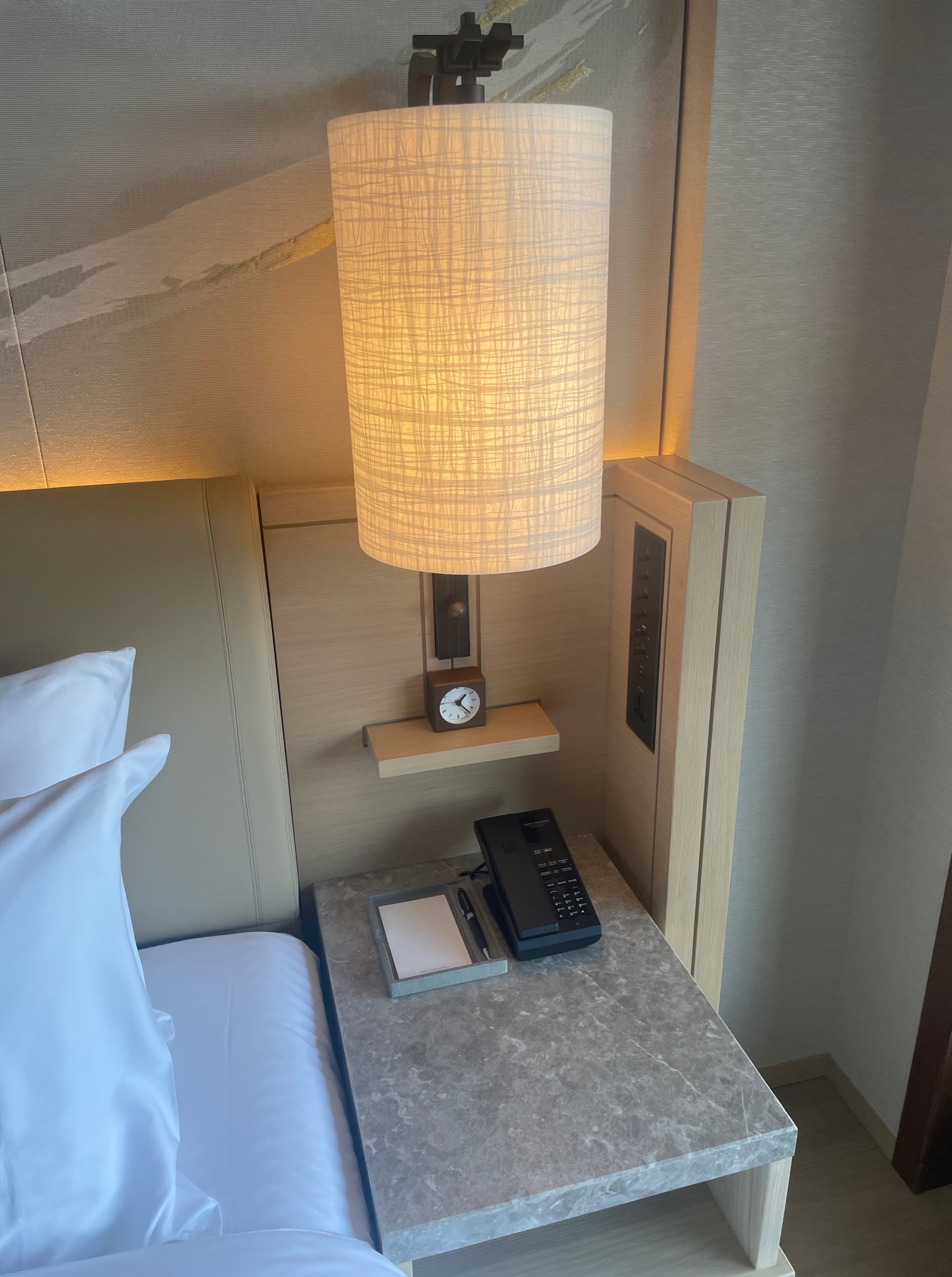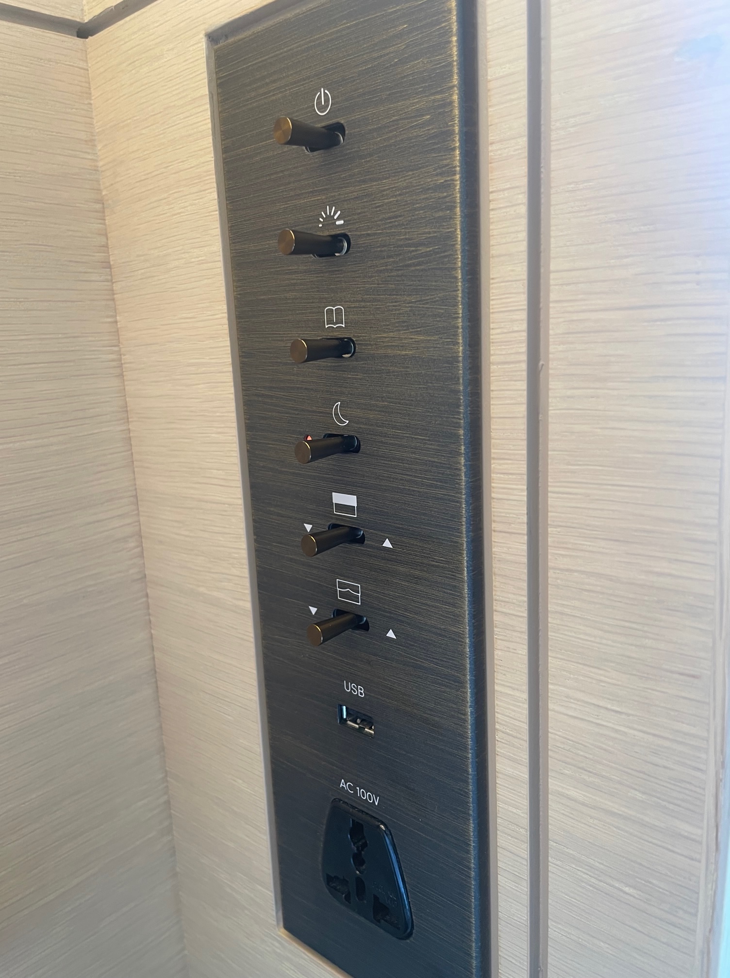 ベッドサイドにはコンセント、USBコンセント、室内の電気やシェードを操作できるスイッチがあります。こういったスイッチも何だかおしゃれです。