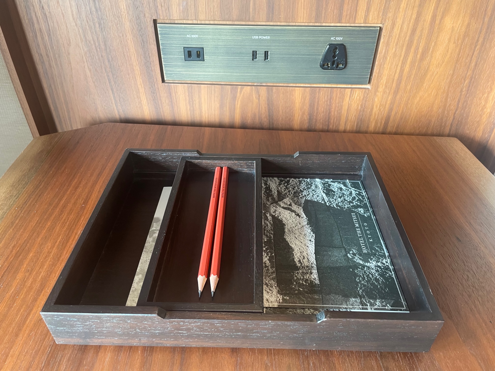 箱の中には鉛筆などが入っています。またコンセント1口、マルチコンセント1口、USBコンセント2口がありデスクでの作業も問題なさそうです。