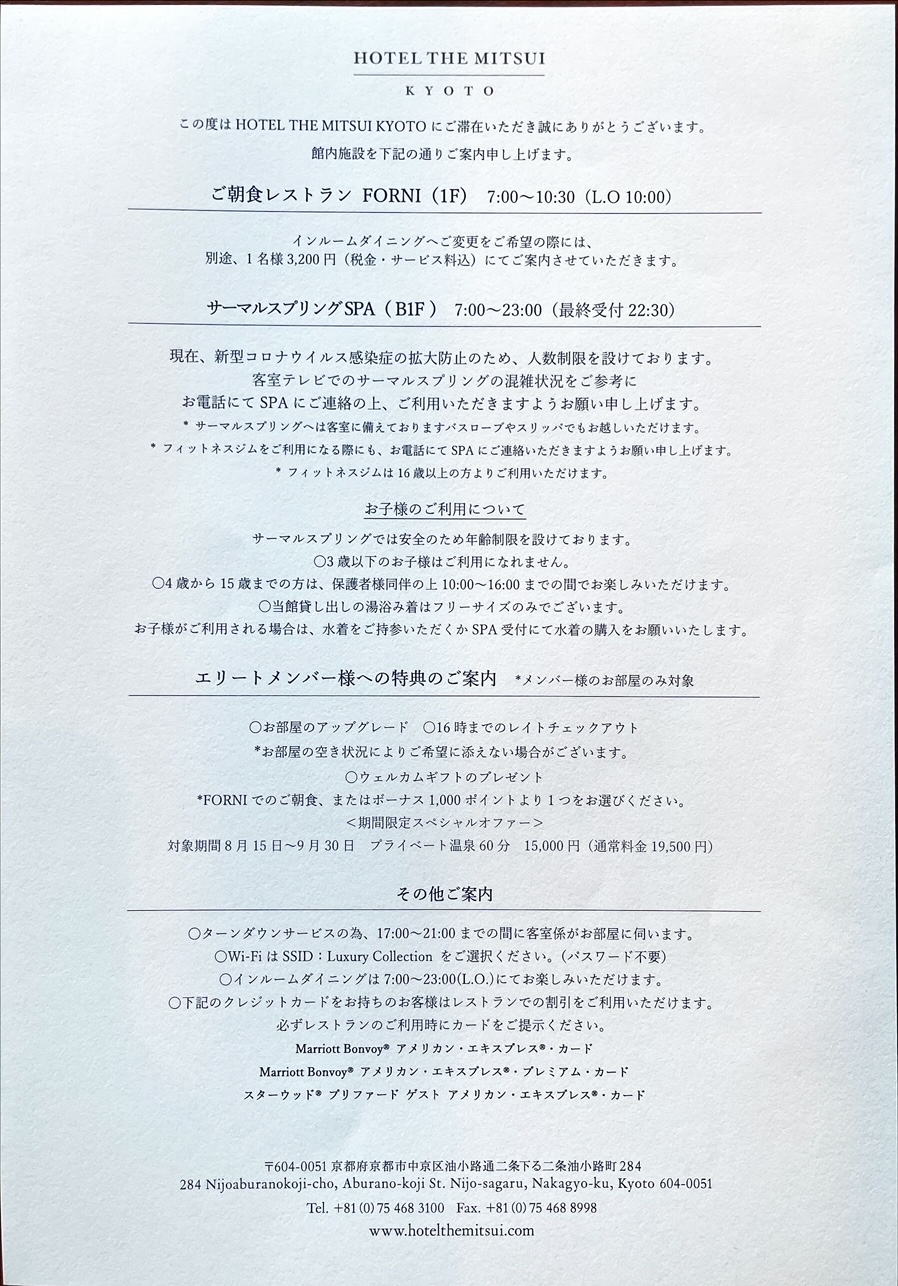 ちなみにHOTEL THE MITSUI KYOTOのマリオットプラチナ会員以上の特典は以下の通りです。
