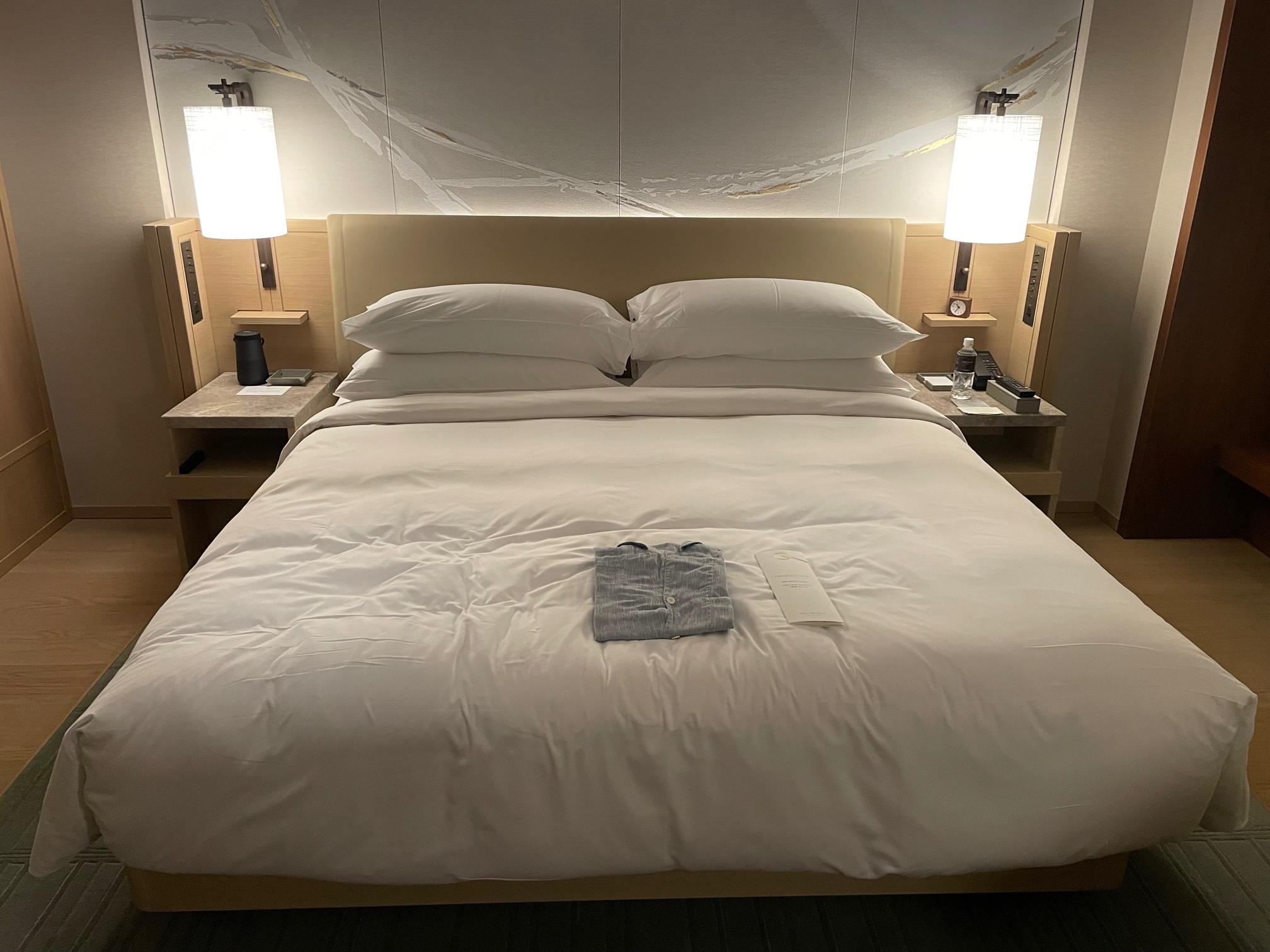 ターンダウン後は枕元には水が置かれパジャマは引き出しから出されてベッドの上に並べられていました!また細かいですが目覚まし時計の向きがベッドから見やすいように変えられていました。