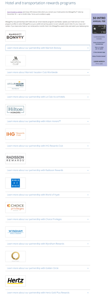 ホテルのポイントからマイレージプラス特典マイルへの移行についてのユナイテッド航空の公式サイトは以下となります。