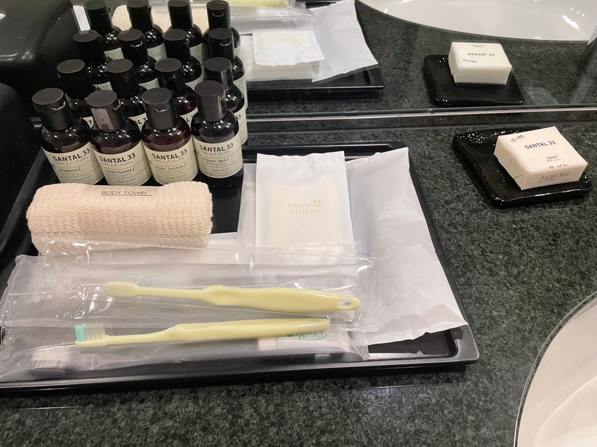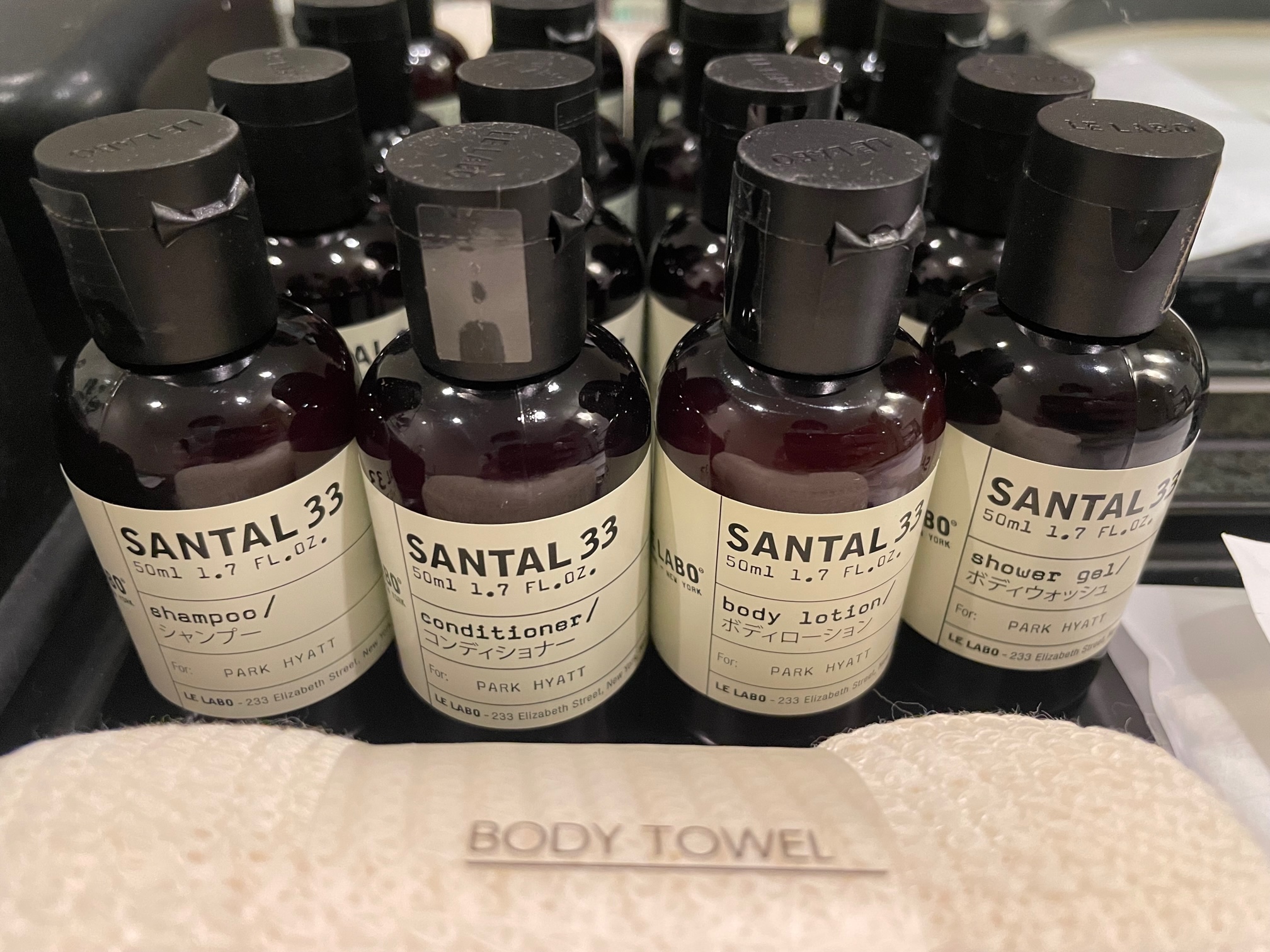 アメニティは見かけたことのないLELABOのSANTAL 33。ハイアットは最近こちらに切り替わったのでしょうか?よく見ると「PARK HYATT」と書かれています(笑)